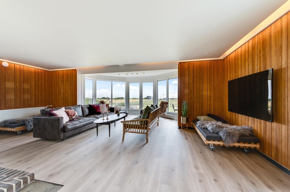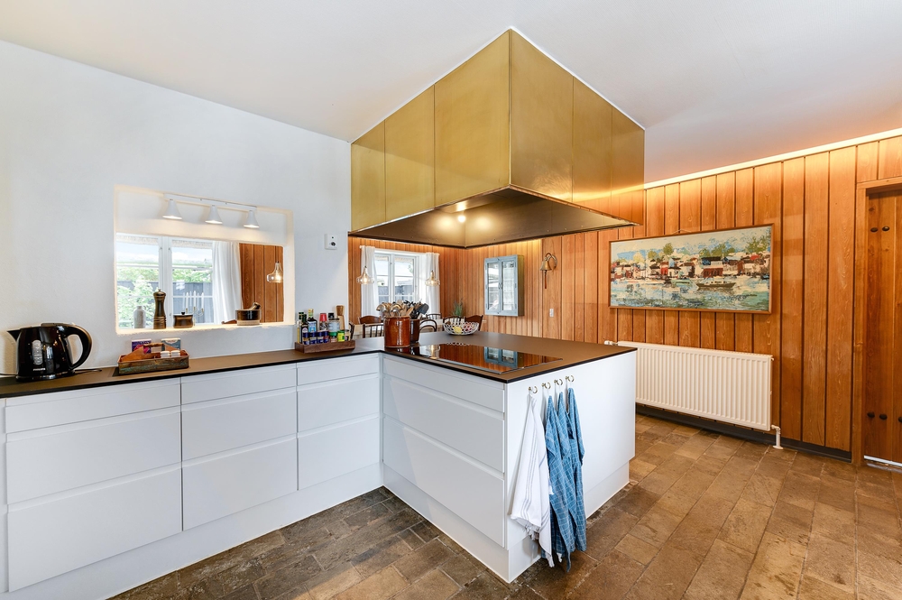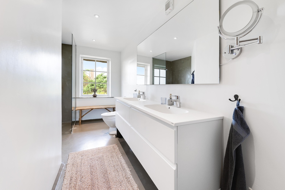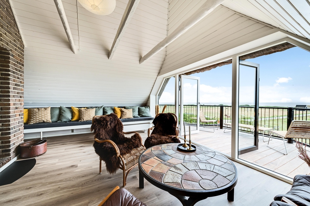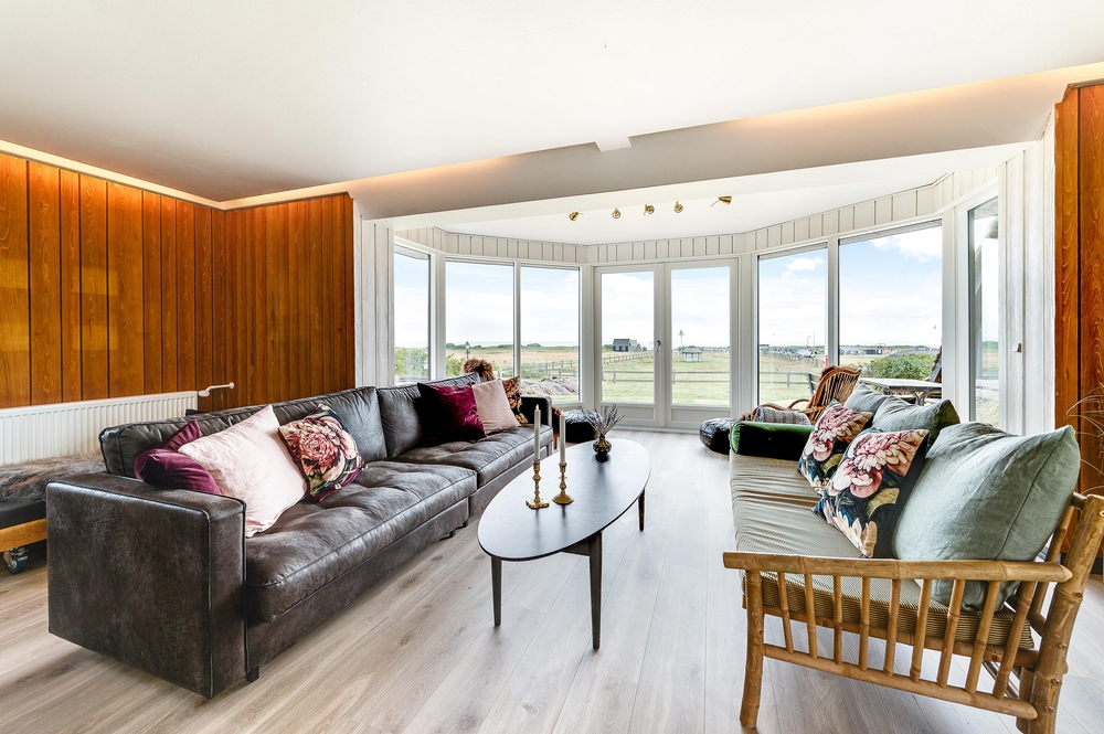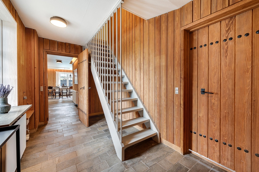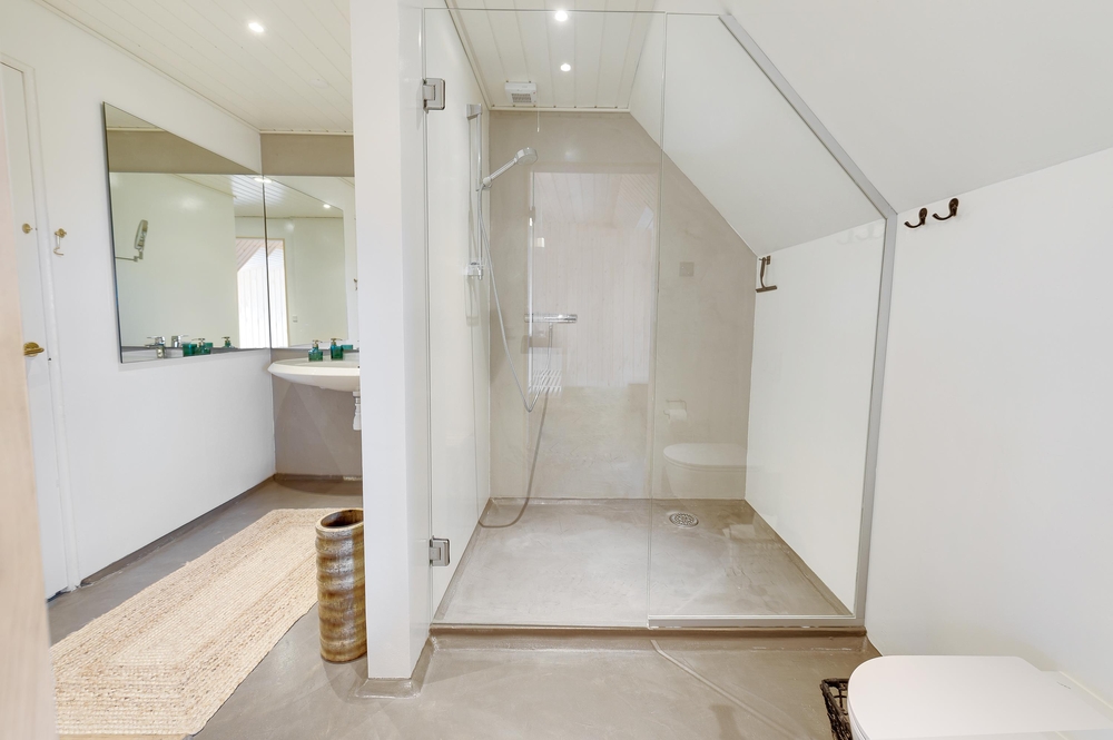 In den Wohnzimmern im Grundgeschoss und Obergeschoss kann man durch die großen Fensterfronten die einzigartige Aussicht zum Fjord genießen oder sich vor dem Kamin versammeln. Der originale Stil des Ferienhauses wurde in der ganzen Einrichtung weitergeführt: Die Kombination aus weißen Wänden, originalen Holzwänden und verschiedenen Holz- und Steinböden schafft eine moderne und gemütliche Stimmung.