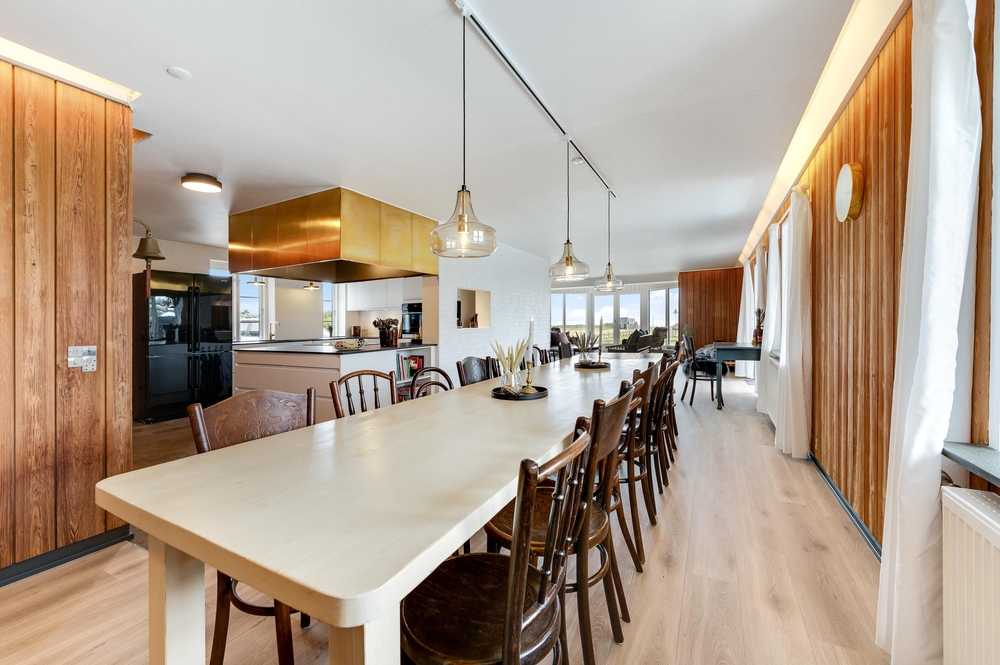 Die moderne Küche hat eine großzügige Ausstattung: Hier gibt es sowohl 2 Öfen, 2 Kühlschränken mit Gefrierfächern und eine Spülmaschine. Die Küche liegt direkt bei dem Essbereich, wo alle Urlaubsgäste bei dem langen Esstisch zusammen die Mahlzeiten einnehmen können. Von hier habt ihr einen direkten Zugang zur großen Terrasse mit dem Außenpool.