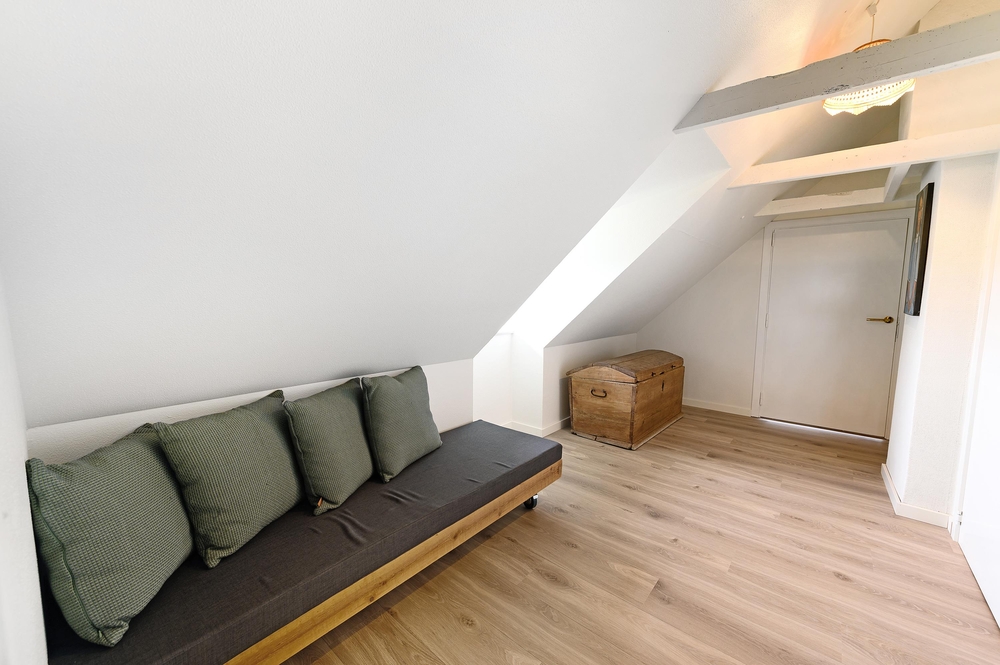 Wenn der Tag zu Ende geht, stehen 7 verschiedene Schlafräume im Unter- und Obergeschoss für euch bereit. Dort wurden helle Farben und gemütliche Betten mit Möbeln in einem älteren Stil kombiniert. Die niedrigen Türen an einzelnen Stellen im 1. Stock neben den hohen, schiefen Decken zeugen vom Alter des Hauses und tragen zu dem gemütlichen Bauernstil bei.