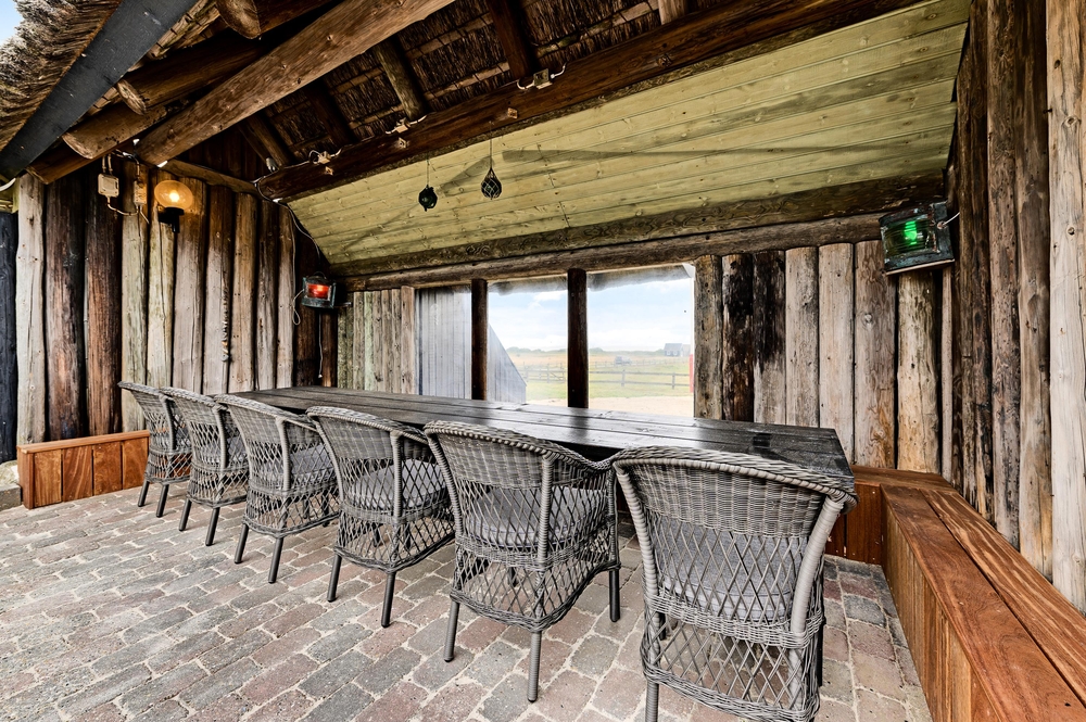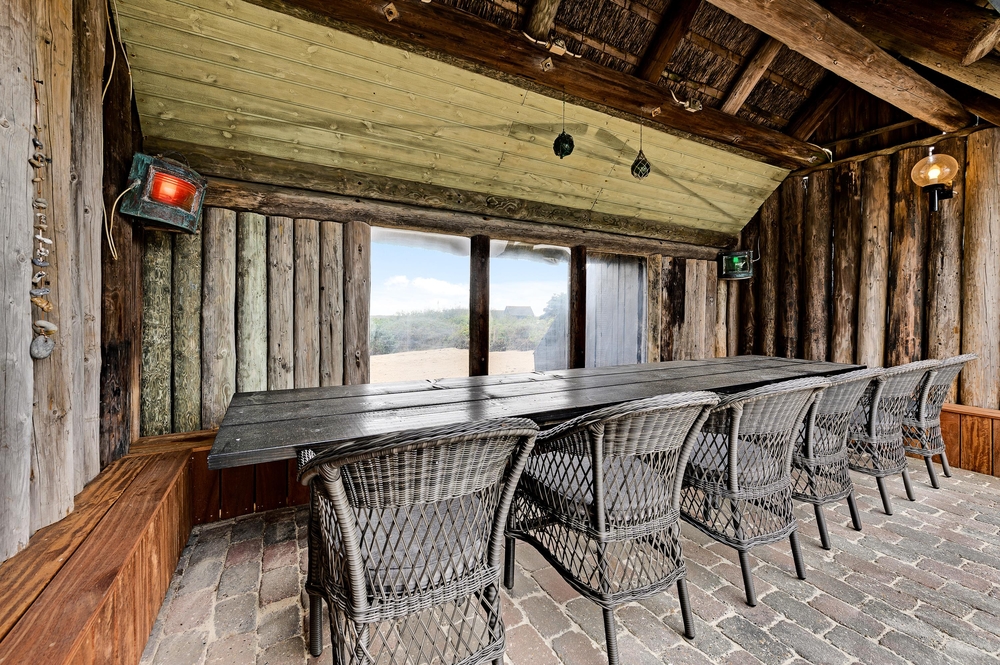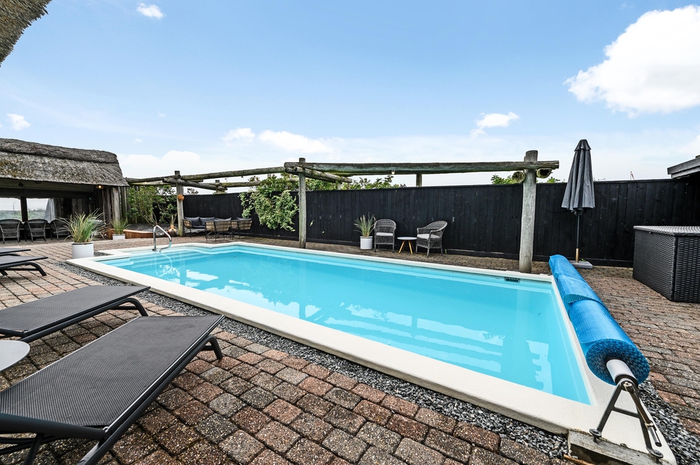 Auf der großen Terrasse an der Seite des Ferienhauses findet ihr den tollen Außenpool, in dem ihr von Mai bis Oktober schwimmen könnt. Je nach der Außentemparatur wird der Pool von einer Solaranlage von 16-26 Grad aufgeheizt. Wenn ihr eine Pause vom Schwimmen im aufgeheizten Pool braucht, könnt ihr auf den Liegestühlen sonnenbaden oder im Schatten auf der überdachten Terrasse einen kalten Drink genießen.