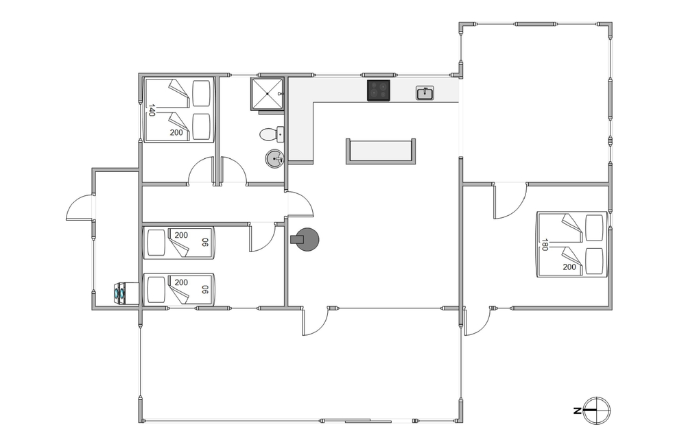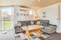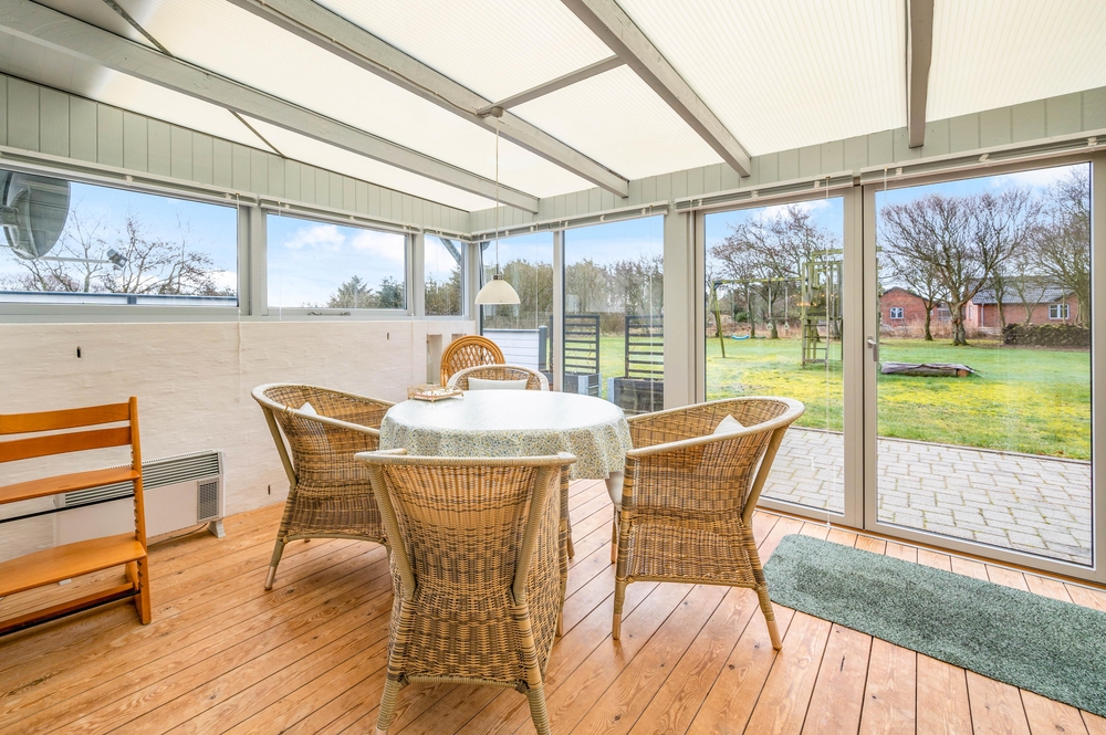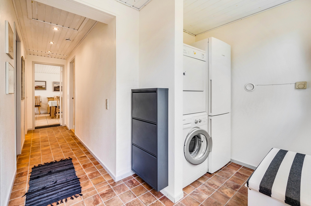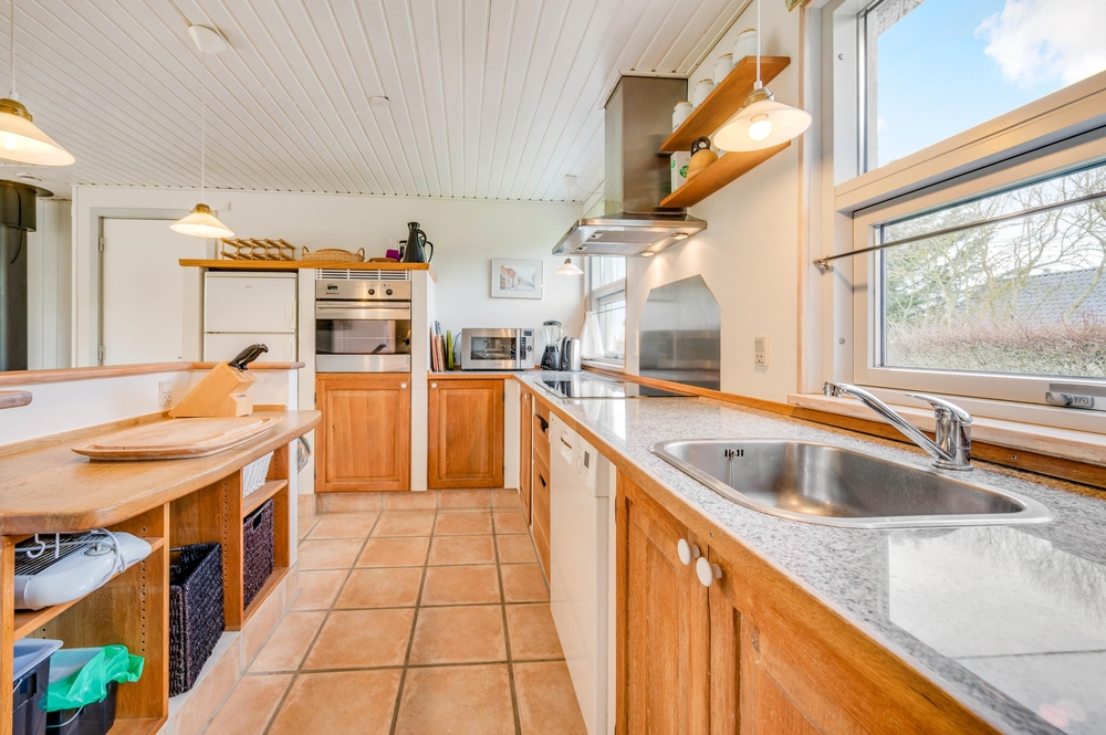Die hell getäfelten Wände, der Holzofen und das schöne Licht aus den Fenstern sorgen für die typische Ferienhausatmosphäre. Der große Wohnraum, der Küche, Wohnzimmer und Essbereich miteinander verbindet, verleiht dem Ferienhaus einen gemütlichen Kern. Hier könnt ihr wirklich Zeit miteinander verbringen.
