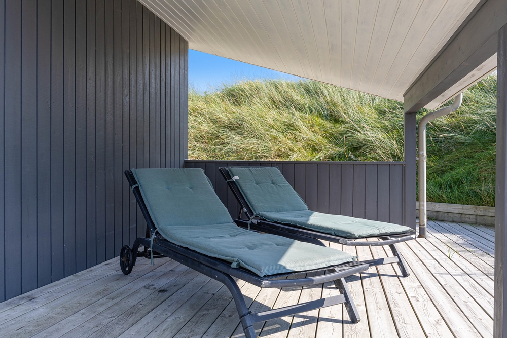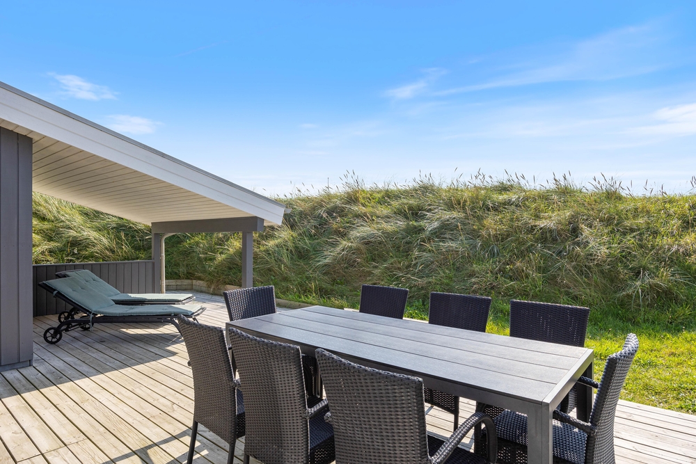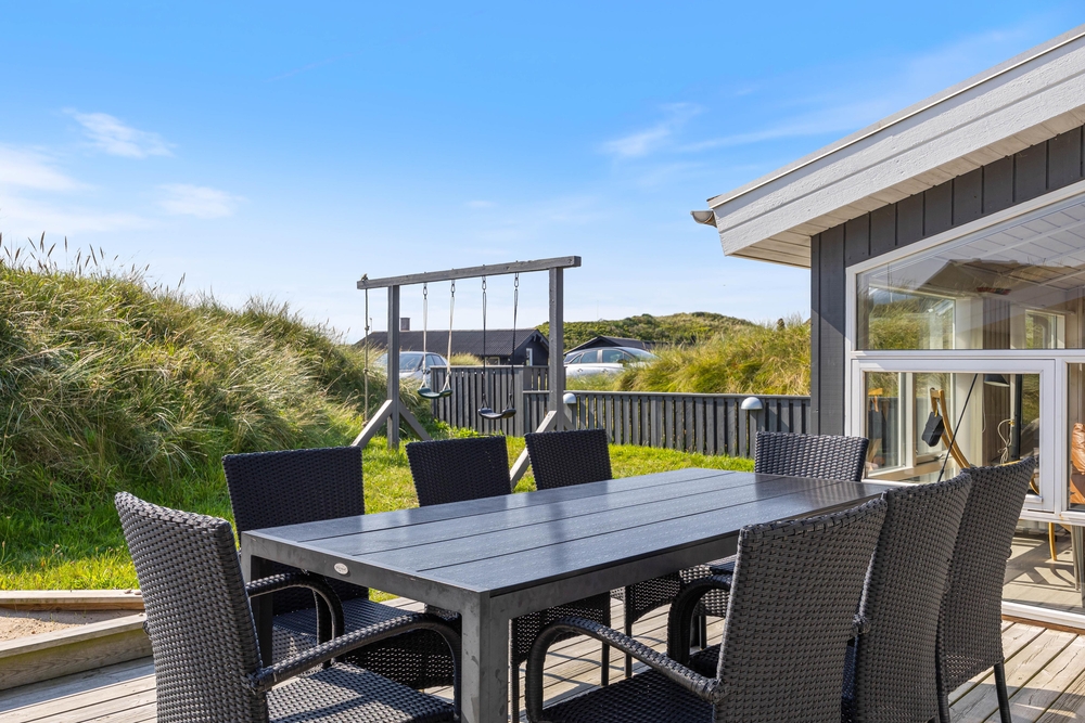 Das Ferienhaus ist von einer großen offenen Terrasse umgeben, welche nach Osten zeigt. Die Morgensonne kann bei einem schönen Frühstück auf der Terrasse genossen werden, während der Tag geplant wird.
