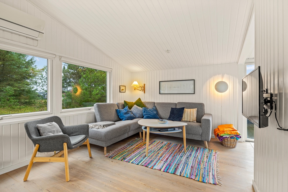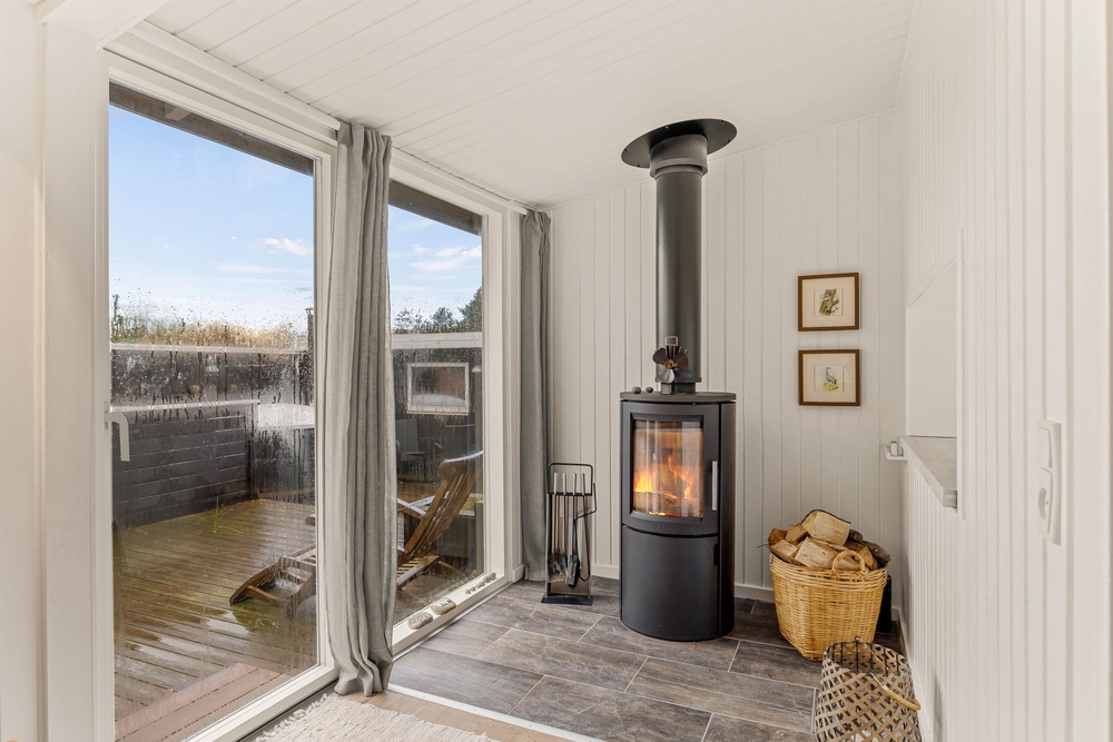 Die Wärme des Holzofens könnt Ihr im Wohnzimmer voll genießen. Das 65 m² große Sommerhaus wird mit sowohl mit Elektroheizung, als auch mit einer energiesparenden Luft-Luft-Wärmepumpe beheizt.