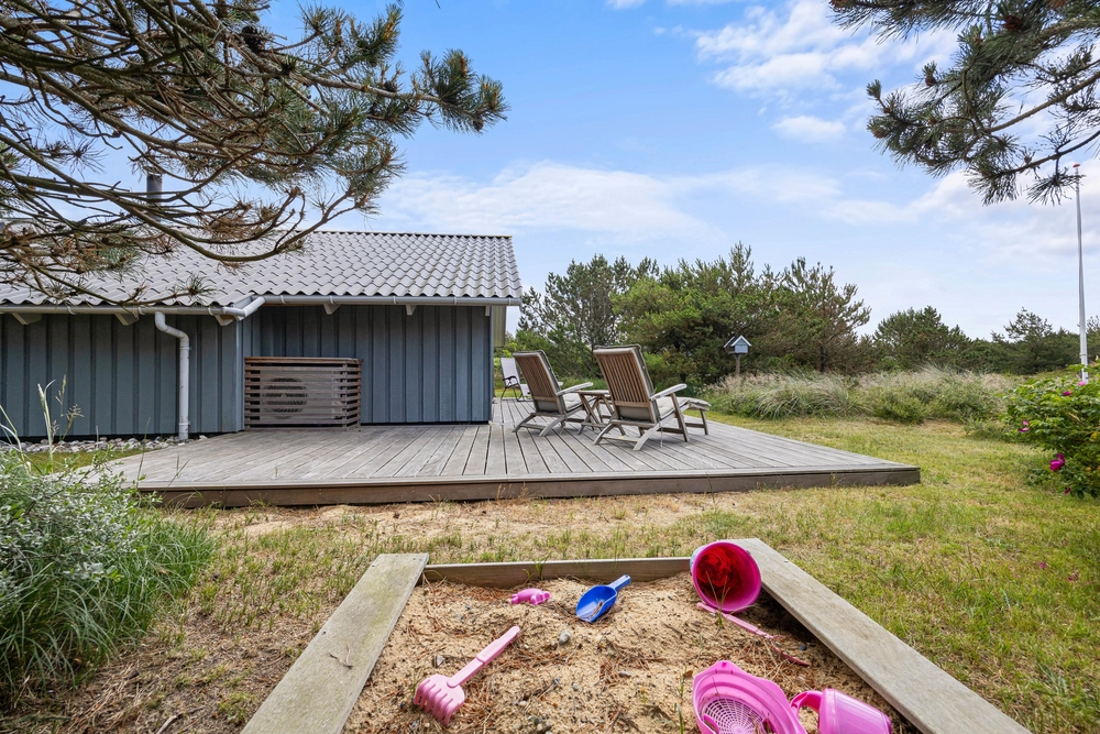 Mit Ausgang vom Wohnbereich tretet ihr direkt auf den überdachten Teil der Terrasse. Die große Holzterrasse zieht sich weiter um das Sommerhaus, so dass ihr viel Platz habt um den schönen Ausblick auf das Naturgrundstück zu genießen. Des Weiteren gibt es eine Fliesenterrasse, wo ihr abgeschirmt sitzen könnt, während die Kinder auf dem Rasen spielen. Ebenfalls ist für die kleinen Gäste ein Sandkasten vorhanden.