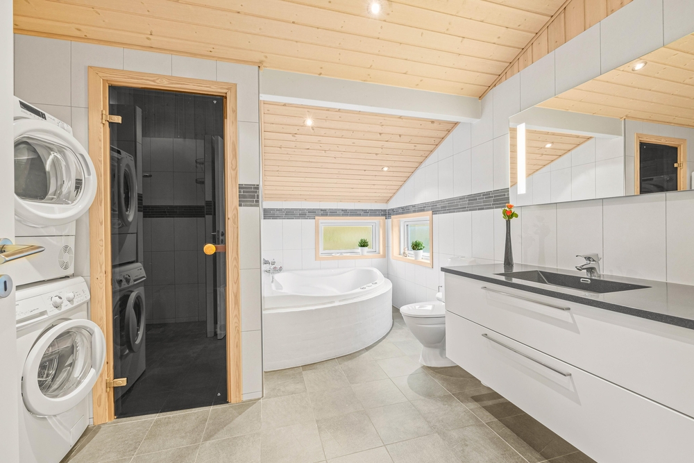 Im großen Badezimmer des Ferienhauses stehen einen Whirlpool und eine Sauna bereit, um euch eine Wellnessstunde ? für Klein und Gross ? zu gestatten, und Ihr eine schöne Auszeit genießen könnt.