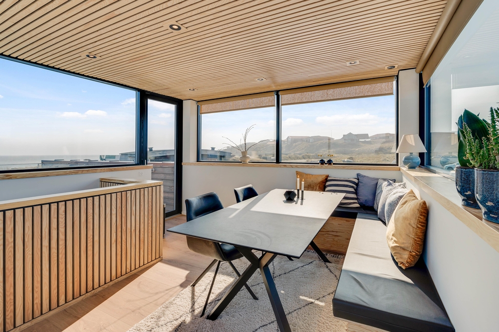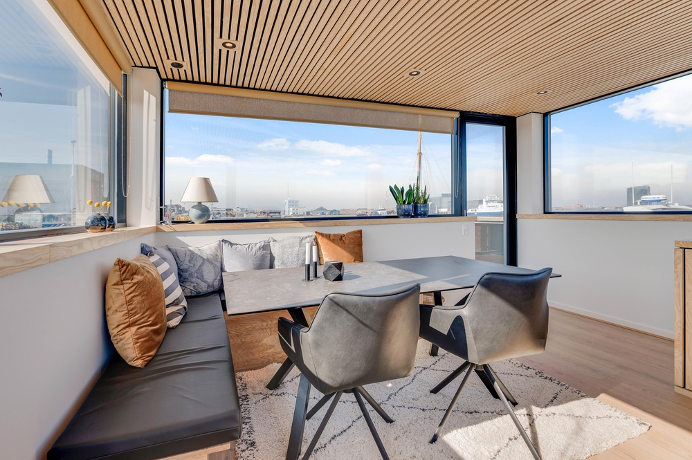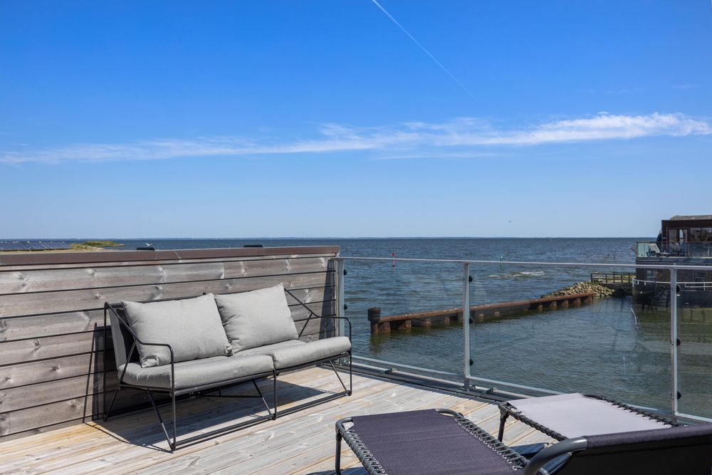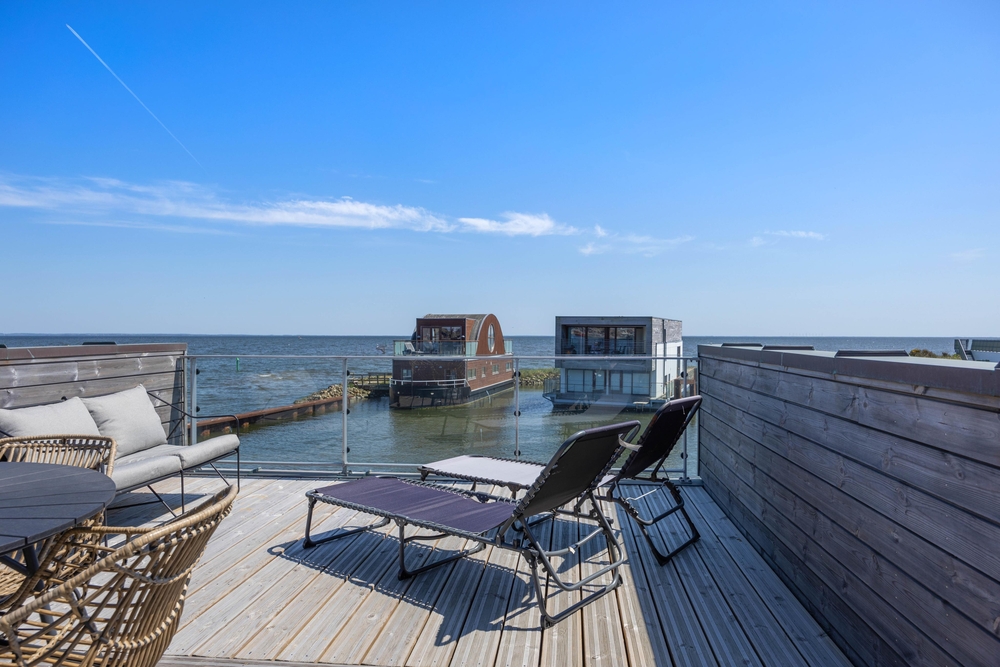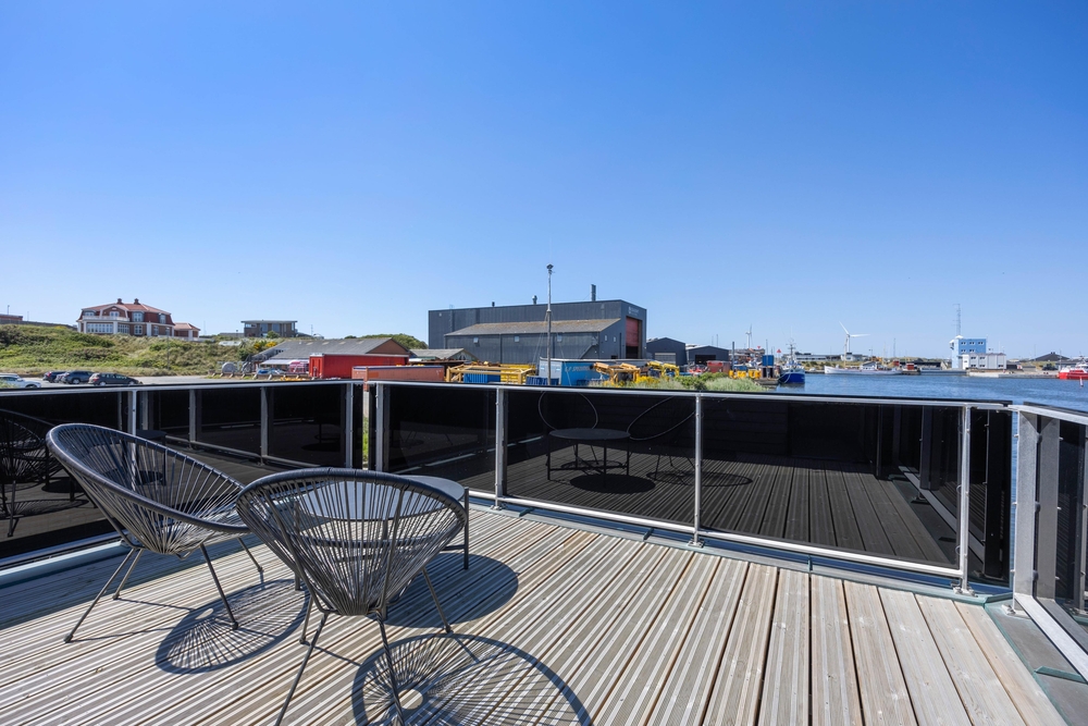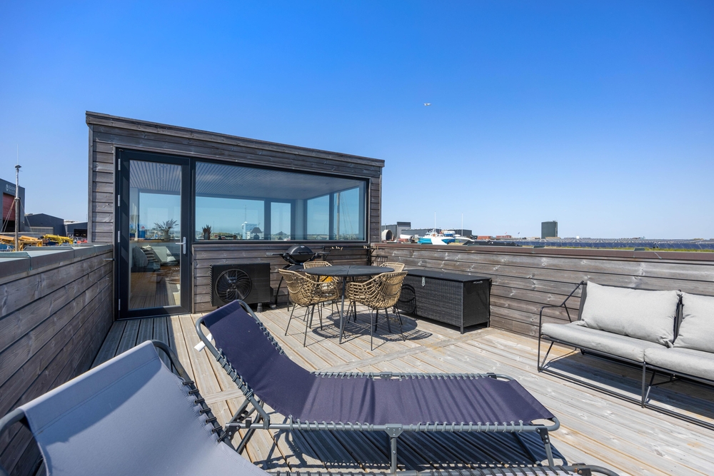 Auf dem Dach eures Feriendomizils erwartet euch ein wunderschöner Außenbereich mit einer Panorama-Aussicht über den Ringkøbing Fjord und den Hafen von Hvide Sande. Auf gemütlichen Gartenmöbeln könnt ihr hier bequem die Idylle und die frische Luft der dänischen Westküste genießen.