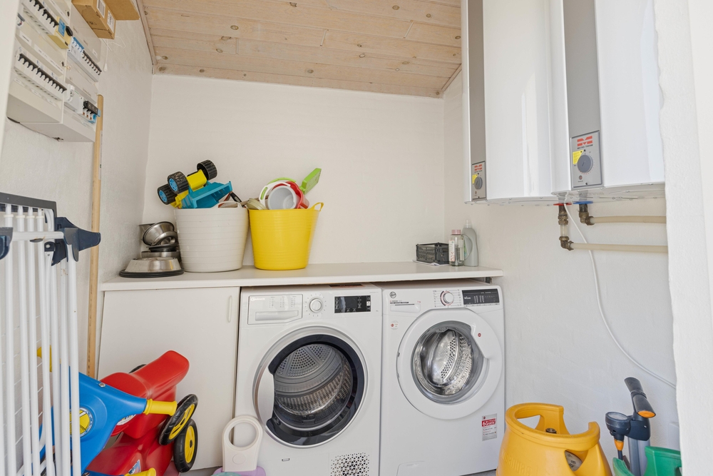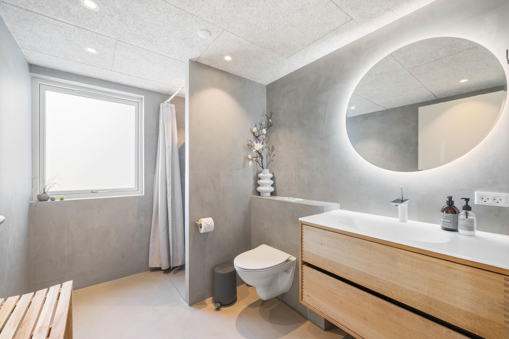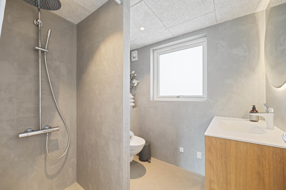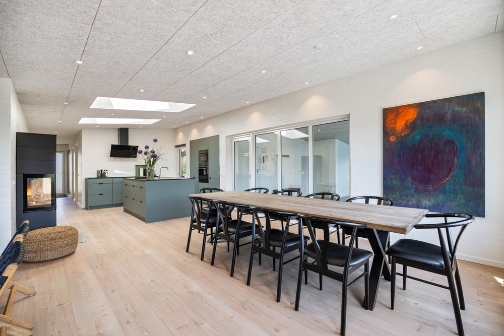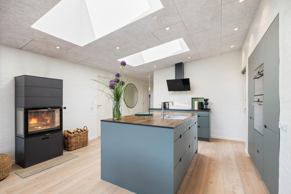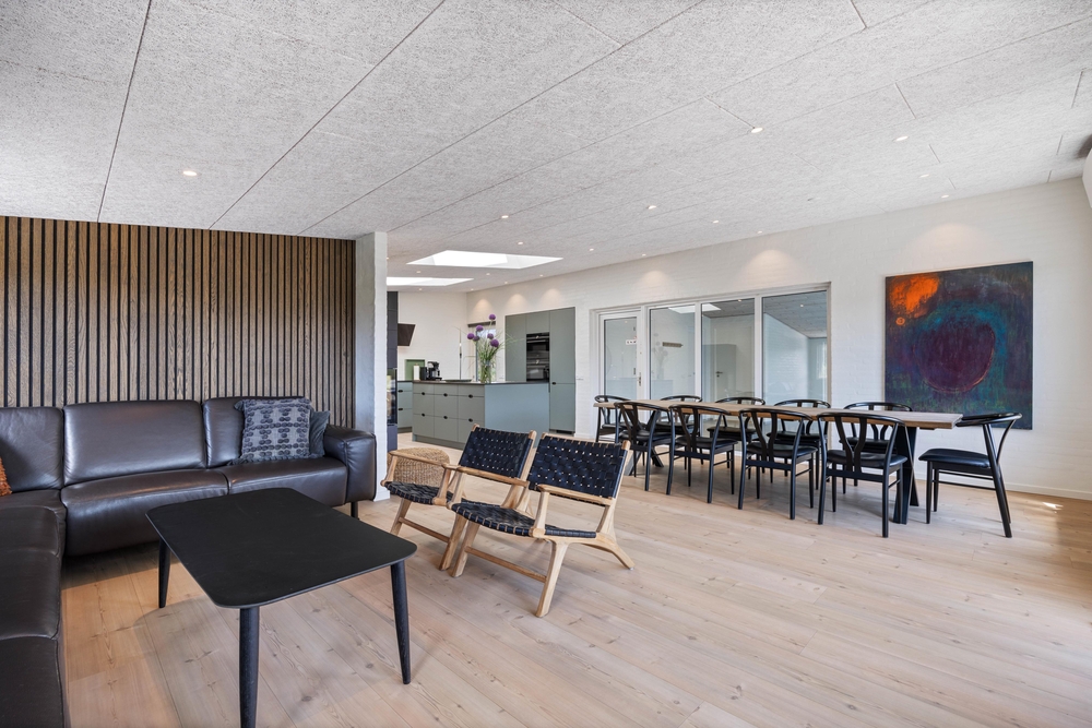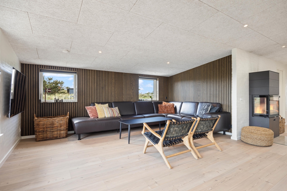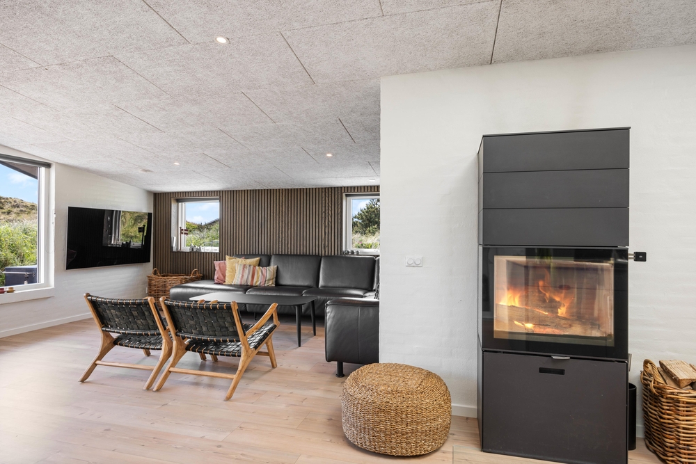 Das Wohnzimmer ist mit bequemen Möbeln eingerichtet, in denen man sofort Lust hat, es sich gemütlich zu machen und in einem guten Buch zu stöbern. Eure Serien könnt ihr im Wohnzimmer auf dem 65 Zoll (ca. 165 cm) Fernseher schauen. In diesem Teil des Ferienhauses befindet sich der schöne Holzofen des Ferienhauses, der sowohl Gemütlichkeit als auch Wärme ausstrahlt. Natürlich gibt es auch im ganzen Ferienhaus kabelloses Internet, damit jeder mit der Welt außerhalb der kleinen Oase Schritt halten kann.