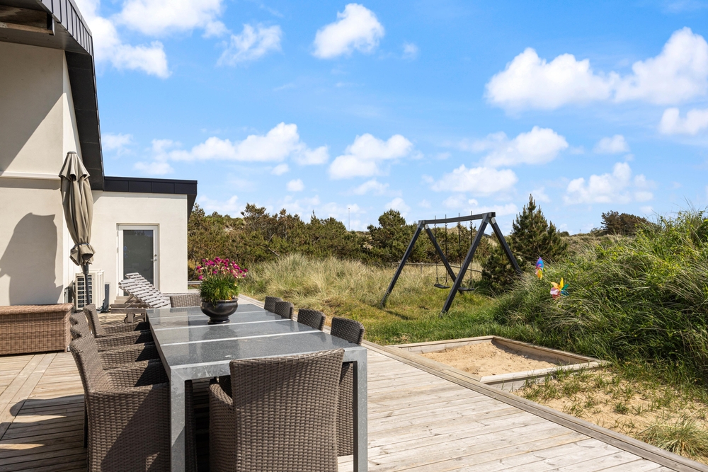 Für die Kinder gibt es sowohl eine Schaukel, ein großes Trampolin als auch einen Sandkasten unmittelbar an der Terrasse, sodass ihr entspannt auf der Sonnenliege dösen und trotzdem die Kleinsten im Auge behalten könnt. Wenn ihr vom Strand kommt, könnt ihr euch den Sand unter Außendusche von April-November gleich von den Füßen waschen.