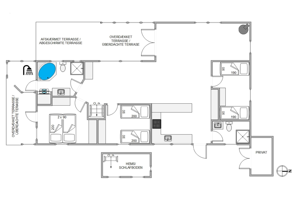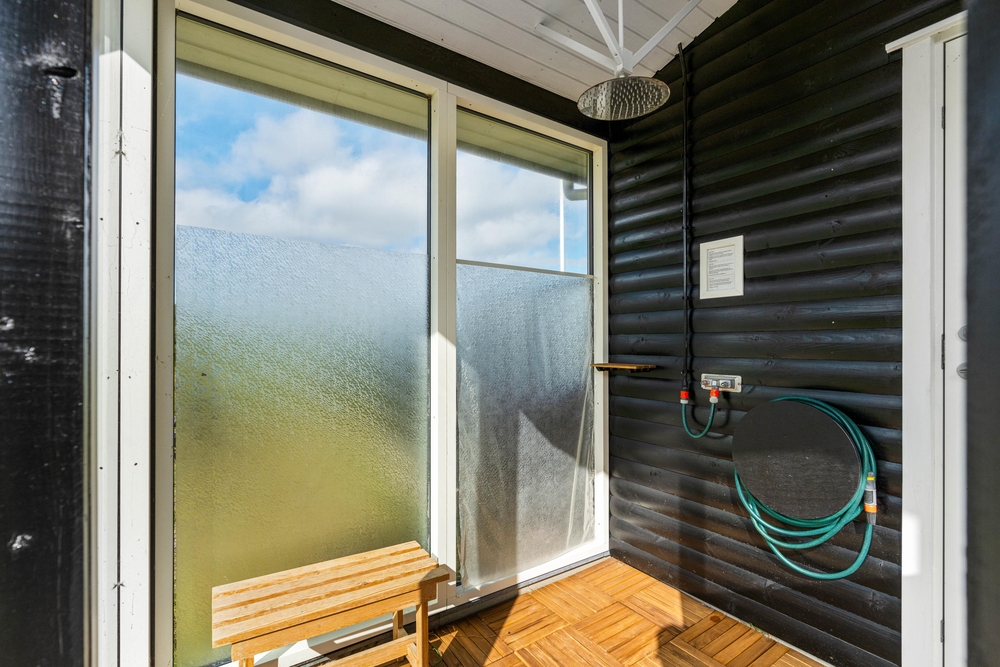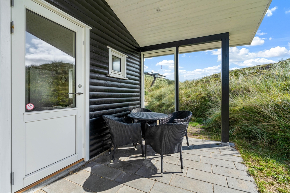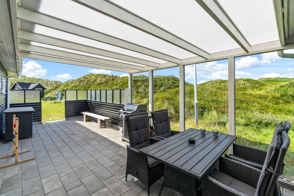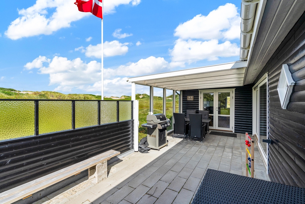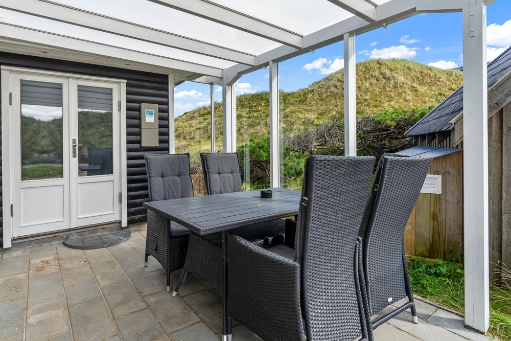Ein Teil der Terrasse ist überdacht und bietet eine gute windgeschützte Sitzmöglichkeit, bei der ihr auf die Aussicht auf euer Dünengrundstück nicht verzichten müsst. An lauen Sommerabenden könnt ihr hier ein leckeres Essen auf dem Gasgrill zubereiten und den Tag bei einem herrlichen Sonnenuntergang, verbunden mit einem Spaziergang am Strand, ausklingen lassen. Zurück am Ferienhaus könnt ihr euch den Sand unter Außendusche am Ferienhaus wieder abspülen. Um Frostschäden zu vermeiden ist diese nur von April-November nutzbar.