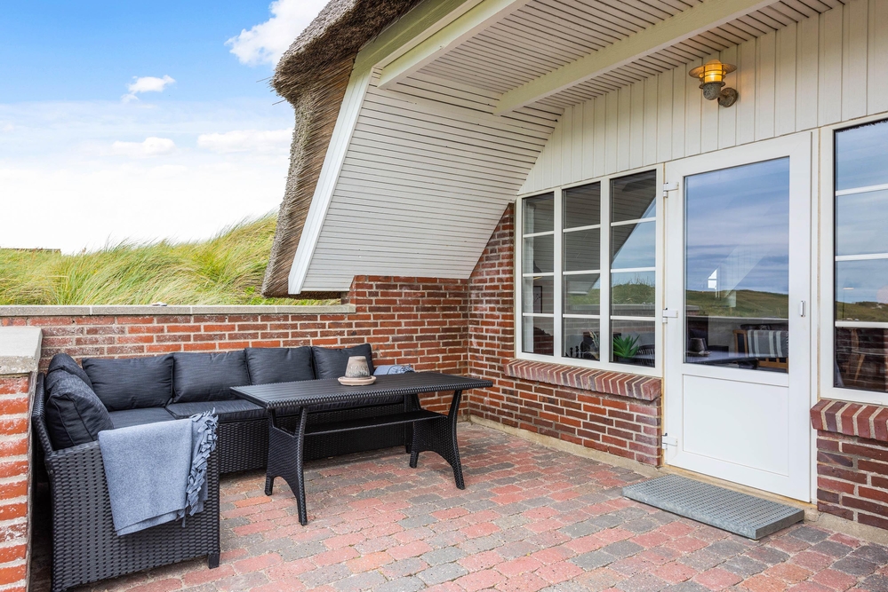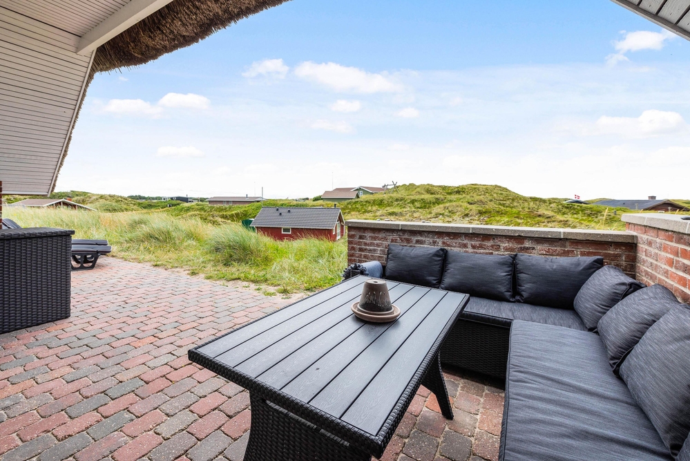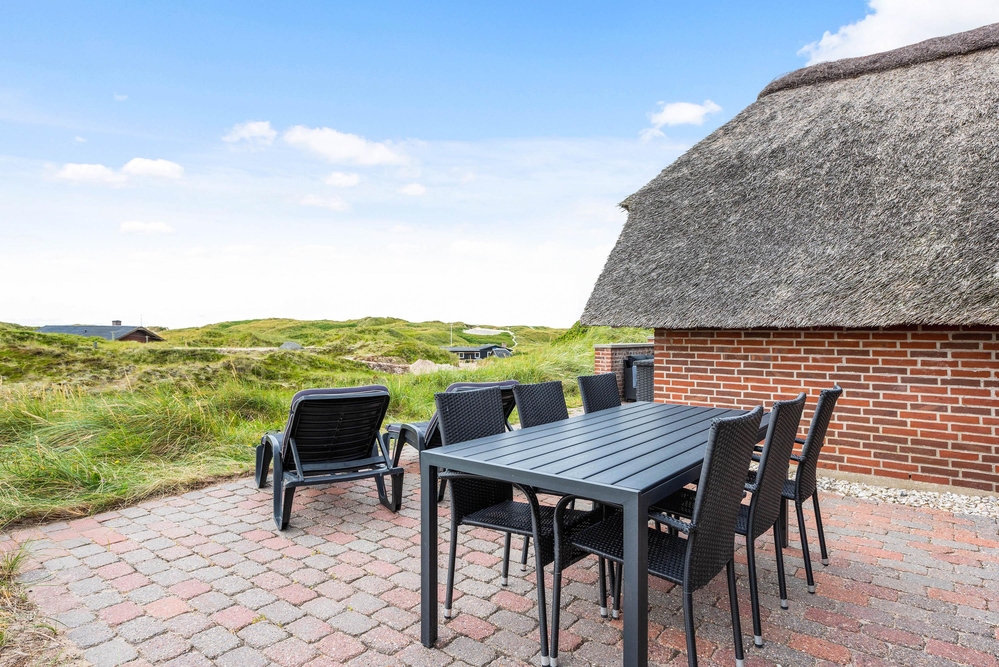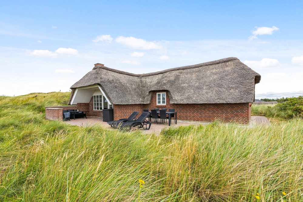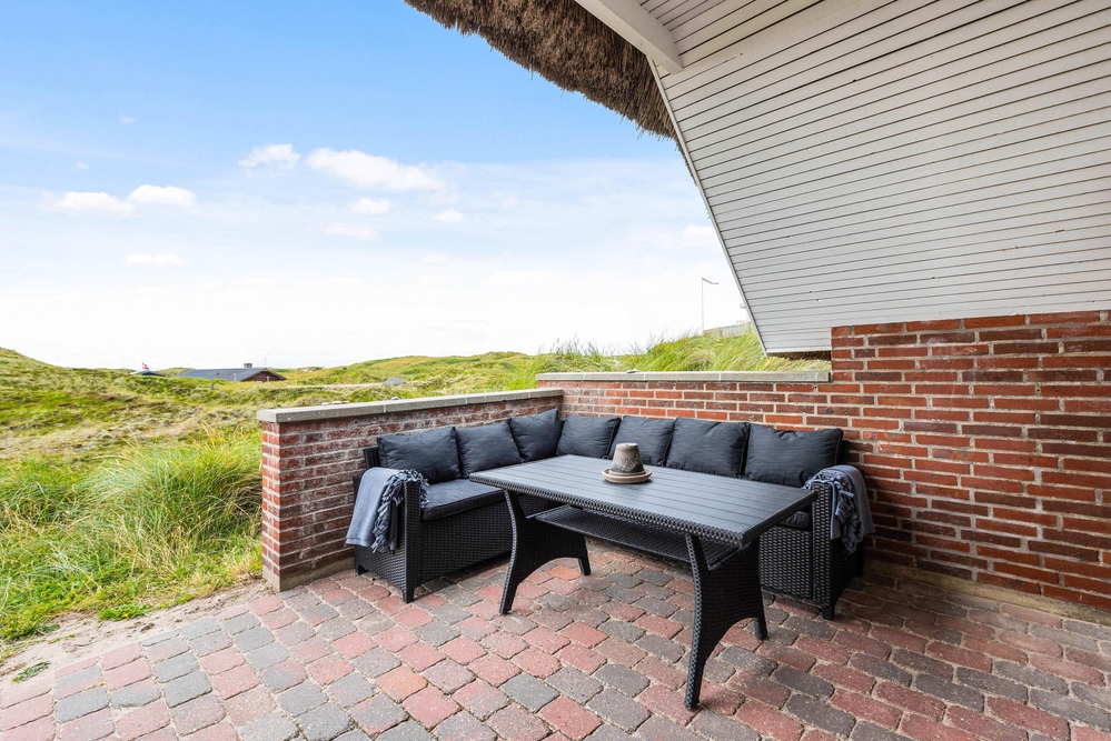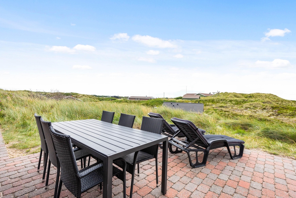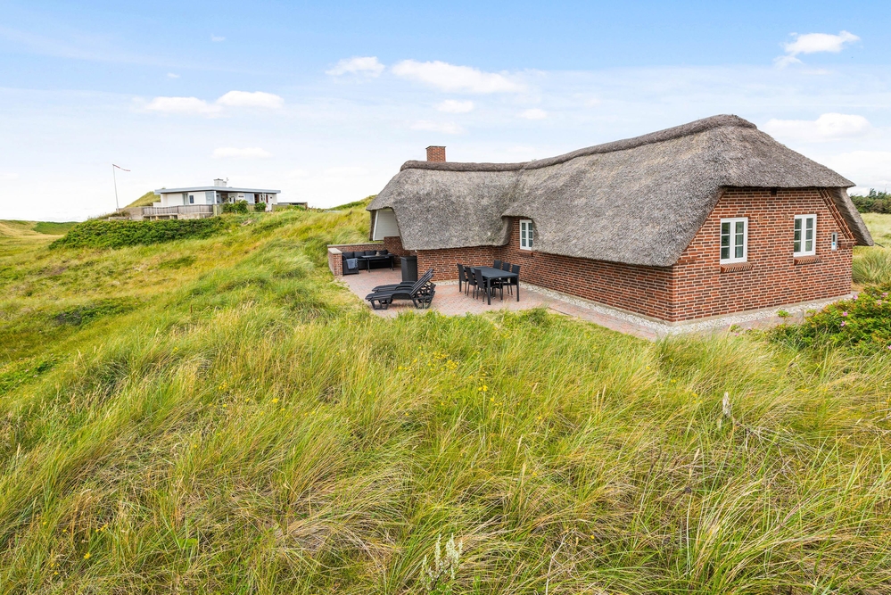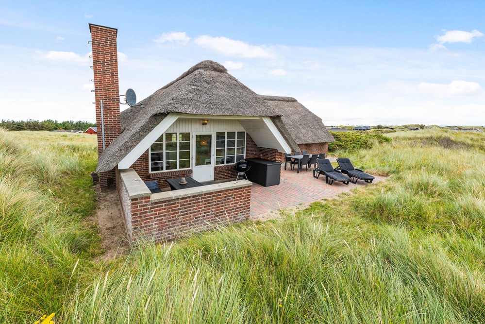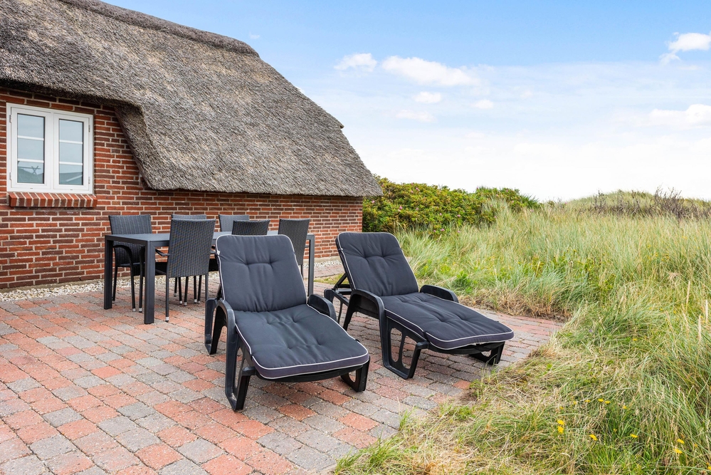Die Terrasse des Ferienhauses ist teilweise überdacht, damit ihr euch auch an einem verregneten Tag draußen aufhalten oder grillen könnt. Dank der leicht erhöhten Lage auf einer Düne habt ihr einen herrlichen Panoramablick und ein Gefühl von Privatsphäre und Naturverbundenheit. Wenn die Sonne scheint, laden die Liegestühle zu einem ausgiebigen Sonnenbad ein. Außerdem sind es von hier aus nur 250 Meter bis zum Meer und dem breiten, endlos erscheinenden Sandstrand.
