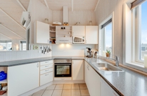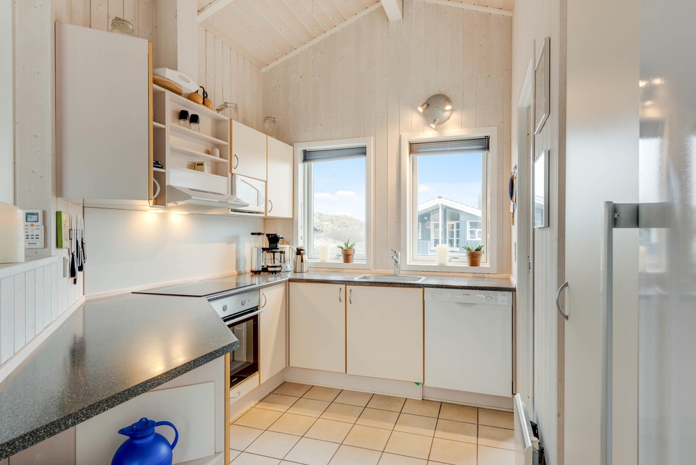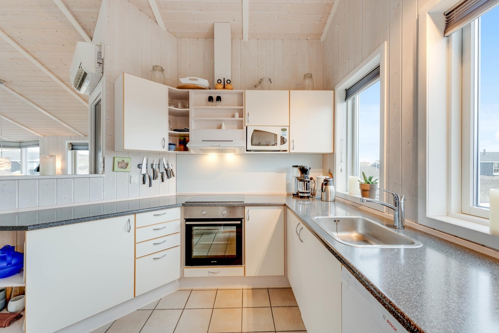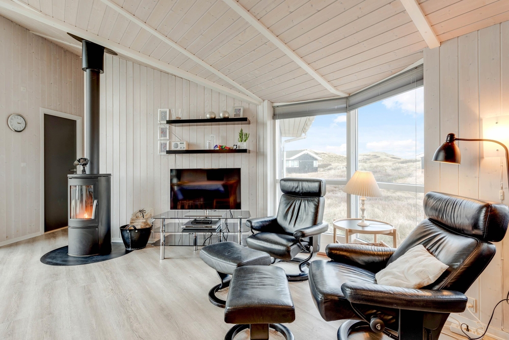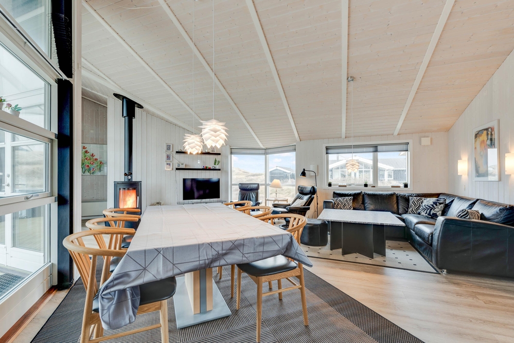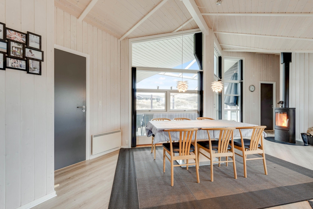 Die Küche und das Wohnzimmer sind miteinander verbunden und die großen Fenster machen den Raum noch offener und bieten Ausblick auf die wunderschöne Dünenlandschaft. Der Holzofen garantiert das ganze Jahr über eine wohlige und gemütliche Atmosphäre.