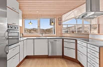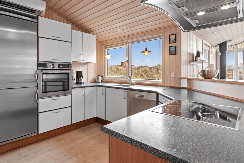 Kocht euch danach etwas Leckeres in der praktisch ausgestatteten Küche, welche u.a. mit Geschirrspüler und 96 L-Gefrierschrank ausgestattet ist. Die Küche ist offen mit dem Wohn- und Essbereich verbunden. Überall im Raum ist die Decke offen bis zum First, Dachfenster und große Fensterpartien lassen die Natur herein. Entspannt auf dem komfortablen Sofa mit einem guten Buch, während das Feuer im Kamin knistert und werft ab und zu einen Blick aus dem Fenster, wo die Natur ganz nahe ist.