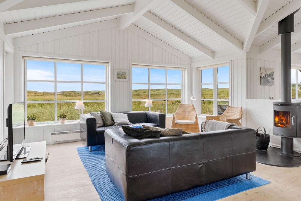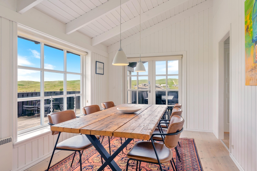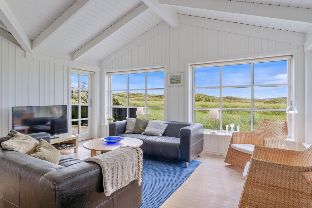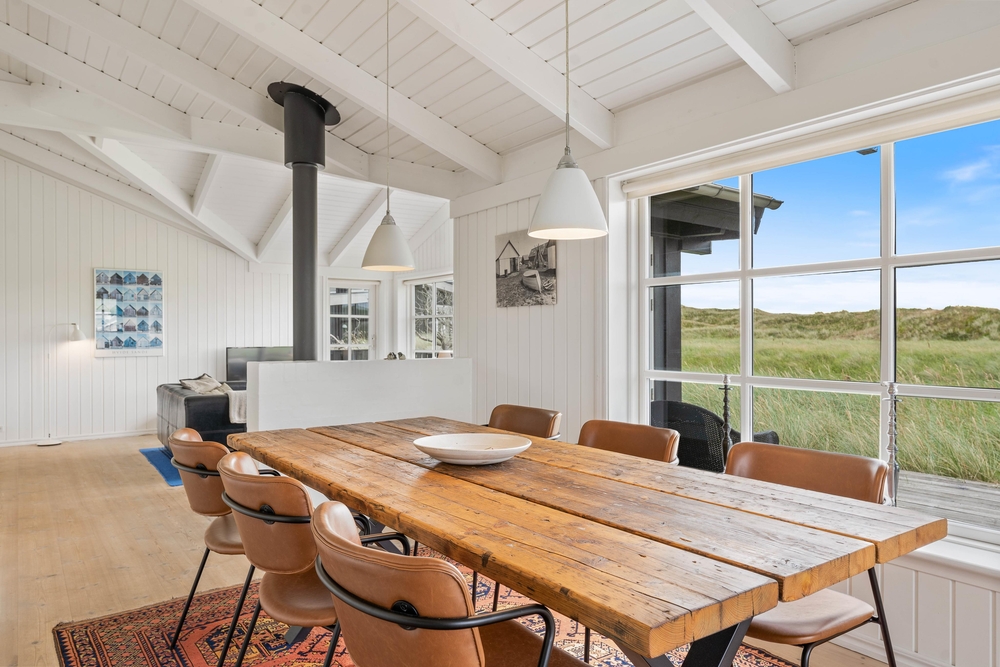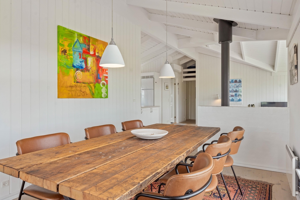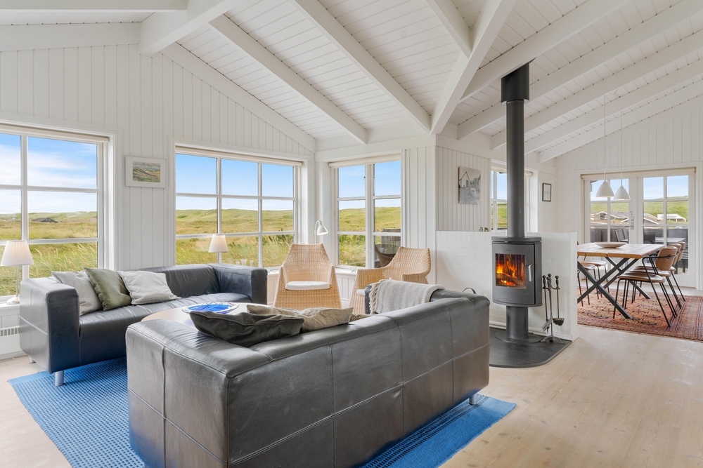 Ein sehr gemütliches und neueres Ferienhaus in Årgab. Das Ferienhaus hat firsthohe, weiße Decken und weiß gestrichene Wänd, zusammen mit der großen Fernsterpartie erscheint das Haus hell und einladend. Die Einrichtung ist sehr geschmackvoll.