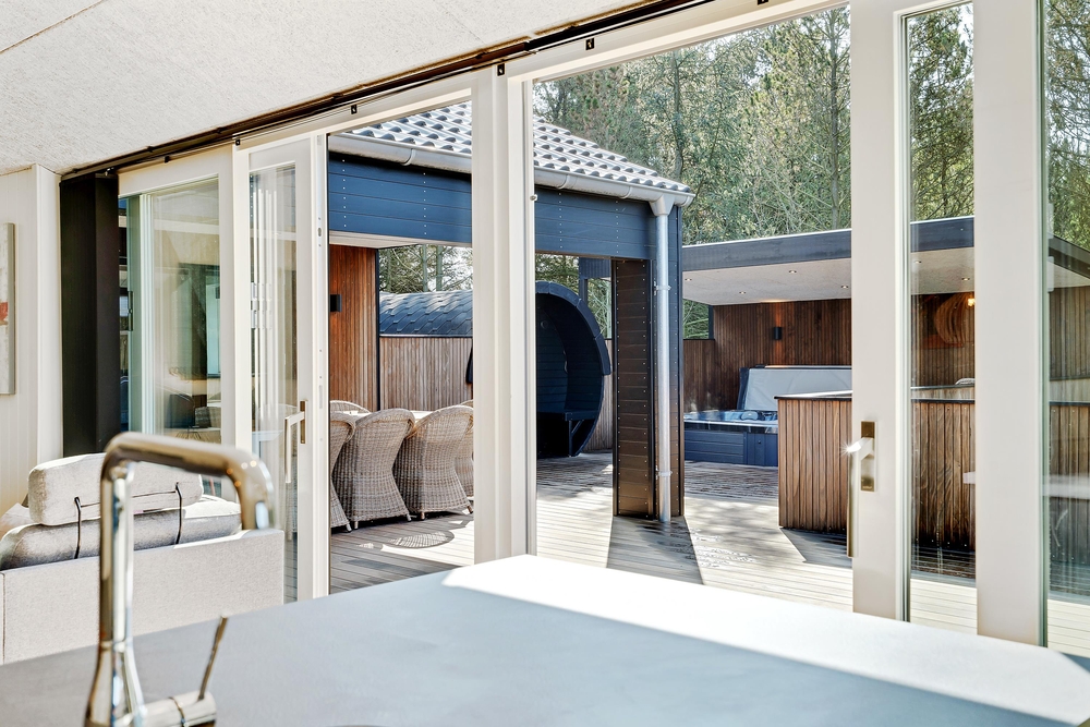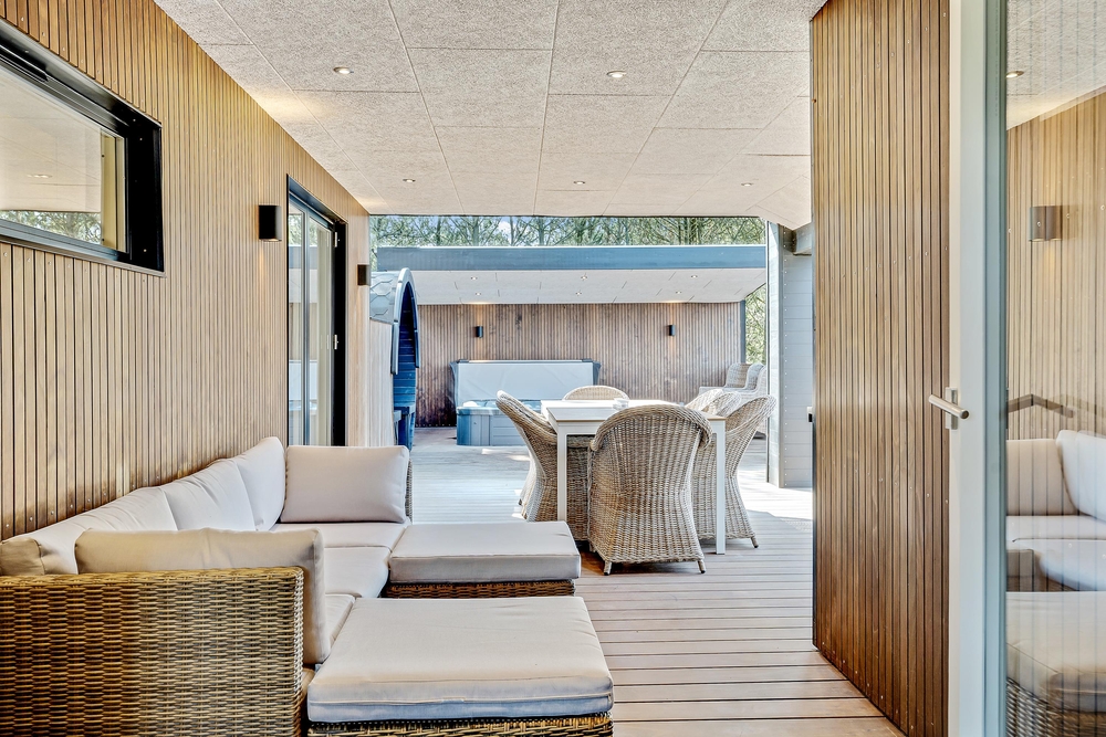 Die große Terrasse beherbergt auch einige der besten Einrichtungen des Hauses. Hier befindet sich der Aussenwhirlpool und eine kühle Außensauna, die auch in den kältesten Wintermonaten für herrliche Wärme und Wohlbefinden sorgt. Es gibt auch einen Spielturm und eine Schaukel für die Kinder.