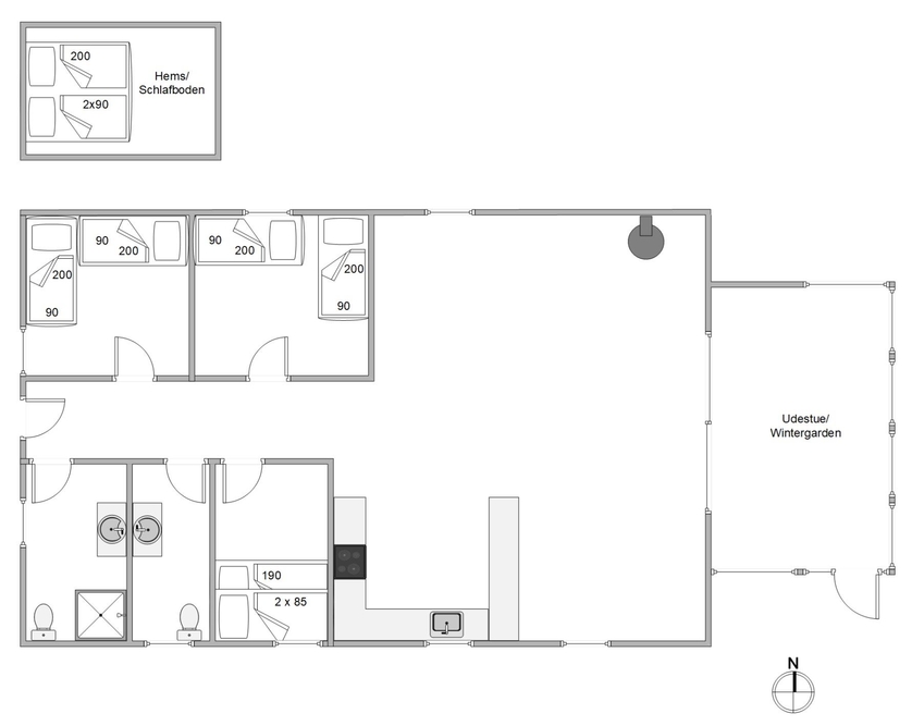 Tankt eure Batterien über Nacht in einem der 3 hellem Schlafzimmer auf, von denen 1 mit einem Doppelbett, 1 mit Etagenbett und 2 mit Einzelbetten ausgestattet sind. Das gemütliche Loft bietet auch 2 Schlafplätze. Ein Badezimmer und eine Gästetoilette sorgen für guten Komfort. Außerdem gibt es einen Holzofen, einen Geschirrspüler, eine Waschmaschine, einen 60l Gefrierschrank und eine Wärmepumpe. Auf dem Fernseher sind deutsche Sender verfügbar.