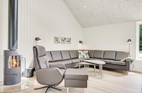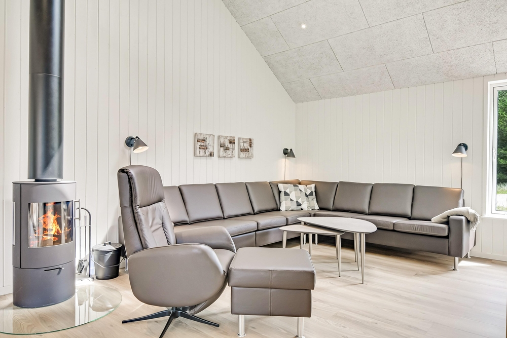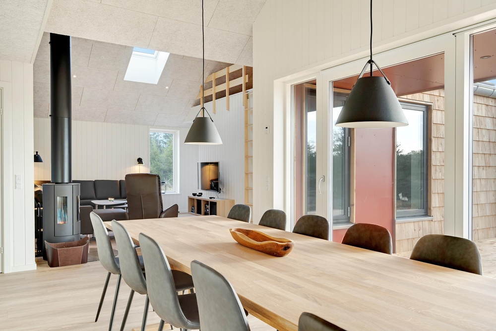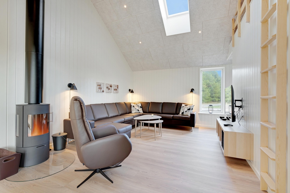 Hohe Decken und die großen Fenster sorgen für viel Licht, was die Umgebung insgesamt offen und einladend macht. Der klassische Holzofen sorgt das ganze Jahr über für eine warme und kuschelige Urlaubsatmosphäre.