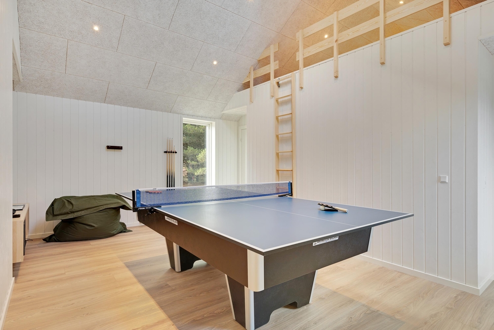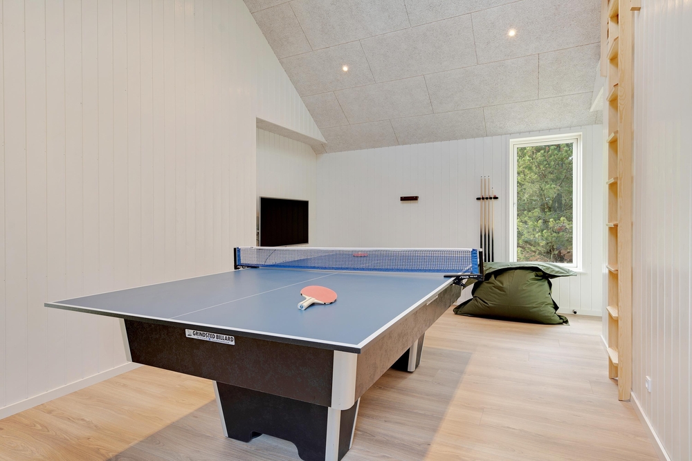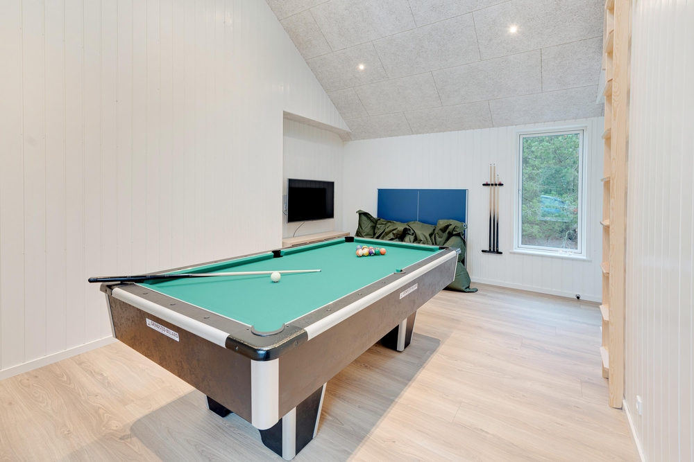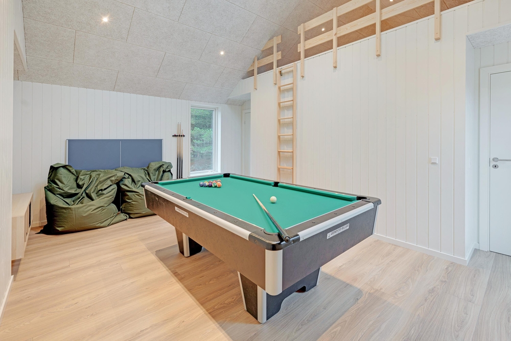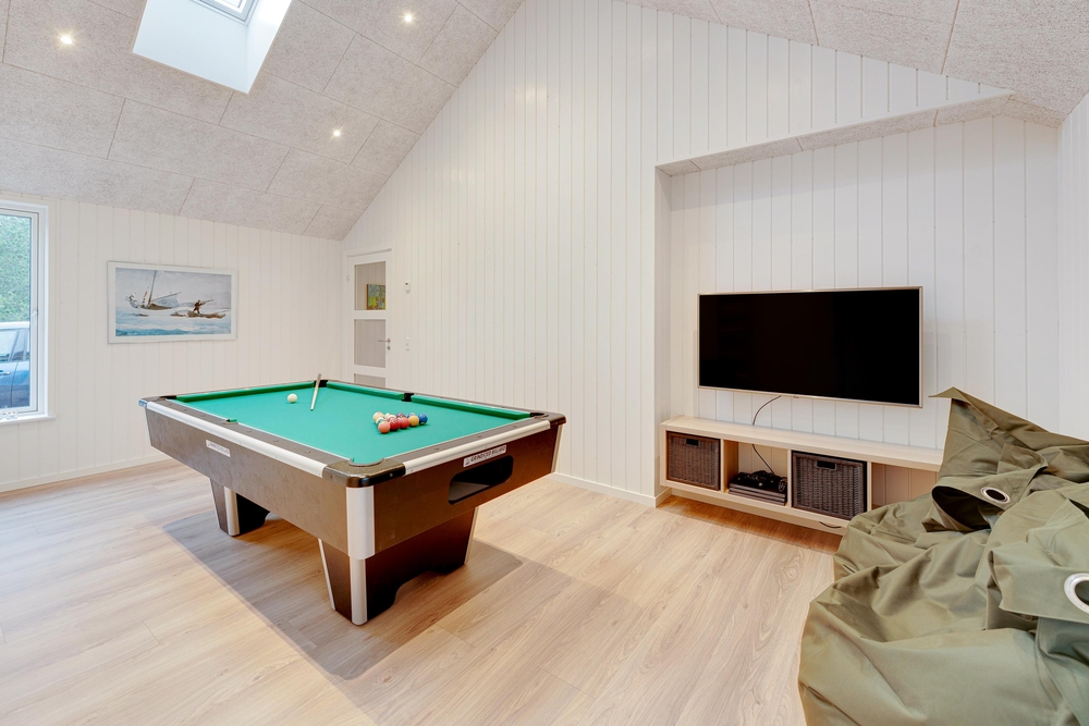 Dieses etwas andere Ferienhaus bietet 156 stilvolle und geräumige Quadratmeter und ist die ideale Wahl für euren nächsten Familienurlaub. Die Einrichtung ist stilvoll und modern und erfüllt auch die Wünsche der anspruchsvollsten Urlauber. Zu den praktischen Einrichtungen gehören eine Spülmaschine, eine Waschmaschine sowie ein Trockner. Viel Platz für Spiel und Spass mit der Familie habt ihr in dem Aktivitätsraum, wo ihr u.a. Tischtennis, PlayStation oder Billard spielen könnt.