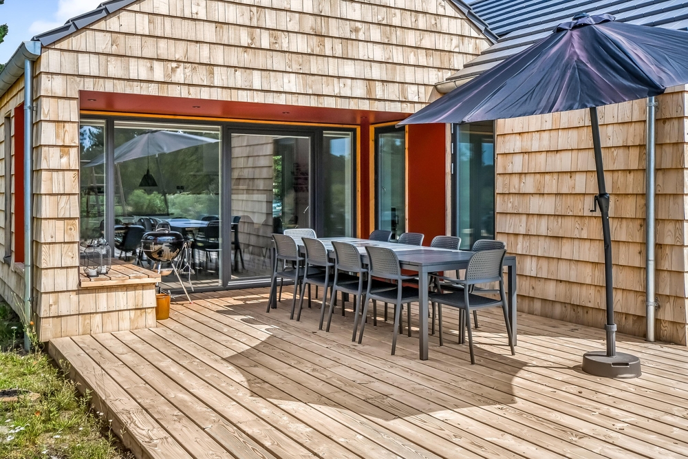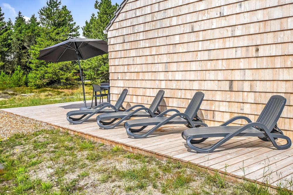Um das Haus herum gibt es eine große, offene Terrasse mit überdachtem Teil auf beiden Seiten. Wenn die Sonne aufgeht, gibt es keinen Grund, das Leben nicht nach Draußen zu verlegen, da Gartenmöbel, Sonnenliegen und ein Grill vorhanden sind. Sollten Wind und Regen vorbeiziehen, findet ihr Schutz unter dem überdachten Teil der Terrasse.