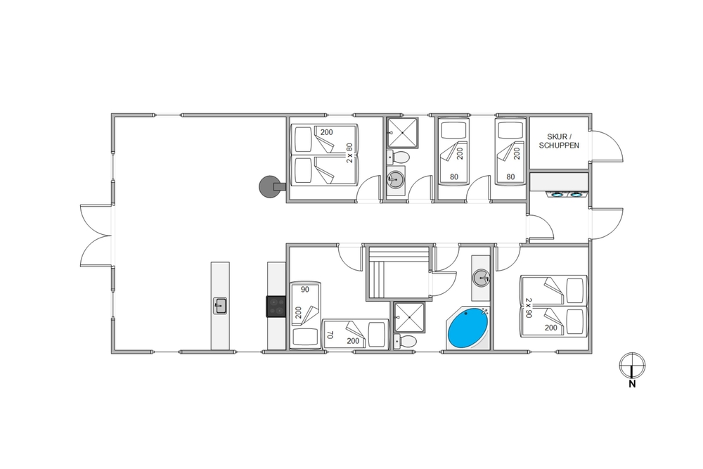 Die insgesamt 4 Schlafzimmer sind mit jeweils 2 Einzelbetten ausgestattet und bieten euch Rückzugsmöglichkeiten für erholsame Nächte. Im Ferienhaus stehen euch 2 Badezimmer zur Verfügung. Die vorhandene Fußbodenheizung verleiht euren Füssen an kühleren Tagen ein angenehm warmes Gefühl. Eines der Badezimmer hält außerdem einen Whirlpool und eine Sauna für euch bereit.
