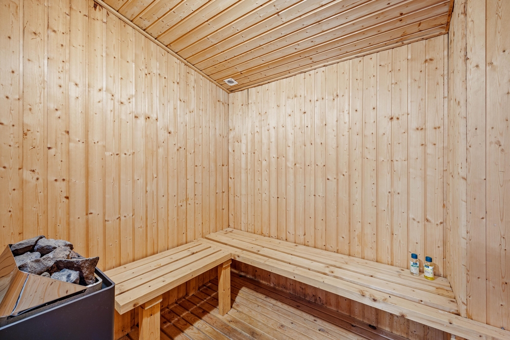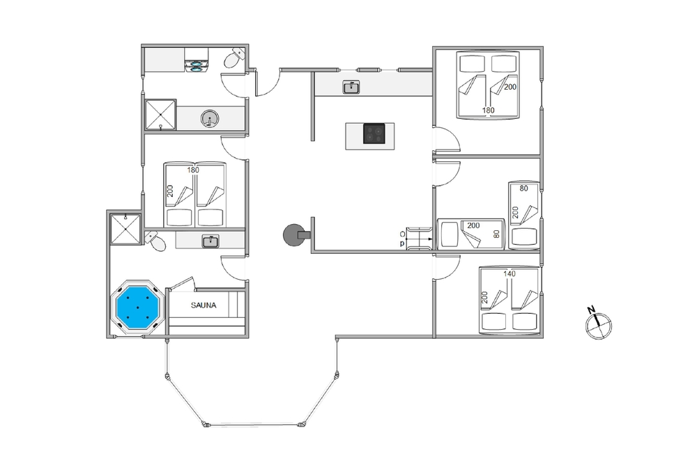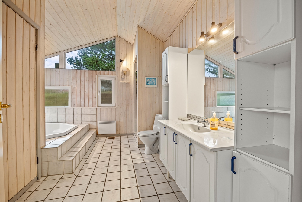 Im Ferienhaus gibt es insgesamt 4 Schlafzimmer. 3 davon mit Doppelbetten und ein Schlafzimmer mit 2 Einzelbetten. Außerdem gibt es 2 Badezimmer auf die ihr euch morgens aufteilen könnt. In dem größeren der beiden sind auch Sauna und ein Whirlpool, für alle die gerne einen Wellnesstag einlegen möchten. Das etwas kleinere Badezimmer hat eine Duschnische und außerdem Waschmaschine und Trockner zu eurer Verfügung.