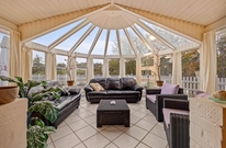 Der offene Wohnbereich mit Küche und Esstisch ist durch kleine, halbhohe Trennwände aufgeteilt, so dass viele gemütliche Sitzecken entstanden sind, in denen man es sich gemütlich machen kann. Das Highlight ist hier natürlich der tolle Wintergarten mit den bequemen Sofas, in denen man sich mit einem Buch zurückziehen oder ein kleines Mittagsschläfchen machen kann. Dabei darf das knisternde Feuer im Kaminofen nicht fehlen. auf