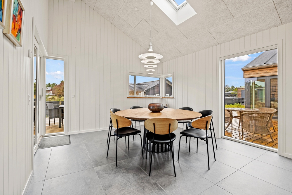 Direkt beim Betreten des offen gestalteten Wohnbereiches fällt einem die helle und freundliche Gestaltung auf. Durch die große Glasfront kommt viel Licht herein und die hohen Decken und bodentiefen Fenster verwandeln das Ferienhaus in eine helle Wohlfühloase. Das bequeme Sofa lädt dazu ein, gemeinsam mal wieder einen Film zu schauen.