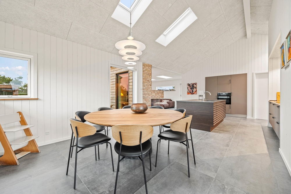 Am großen Esstisch finden alle Platz und können sich auch mal zu einem geselligen Spieleabend versammeln. Für die Gemütlichkeit verfügt der offene Wohnbereich über einen Gaskamin und als zusätzliche Wärmequelle noch über eine Wärmepumpe oder die angenehme Fußbodenheizung.