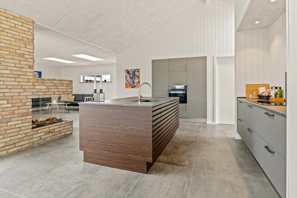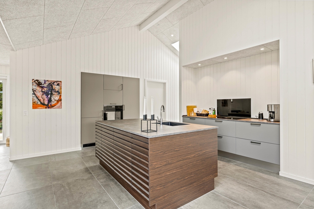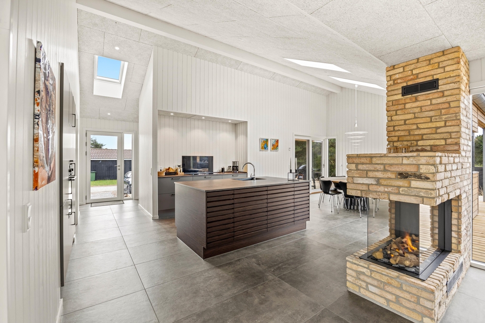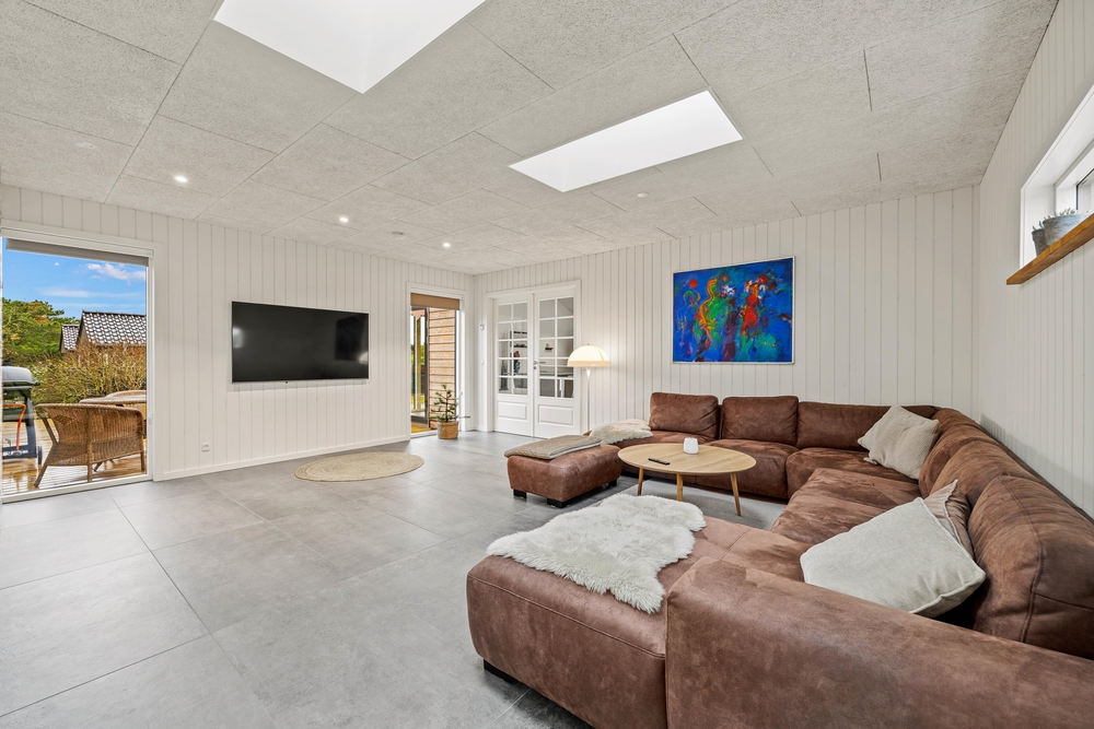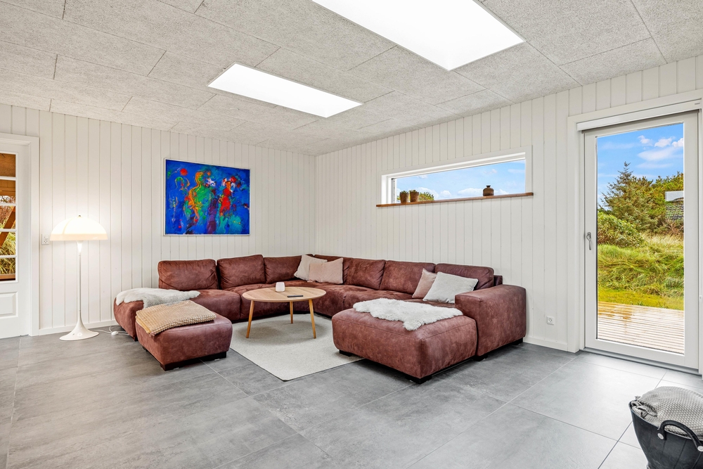 Direkt beim Betreten des offen gestalteten Wohnbereiches fällt einem die helle und freundliche Gestaltung auf. Durch die große Glasfront kommt viel Licht herein, die hohen Decken und bodentiefen Fenster verwandeln das Ferienhaus in eine helle Wohlfühloase. Das bequeme Sofa lädt dazu ein, gemeinsam mal wieder einen Film zu schauen.