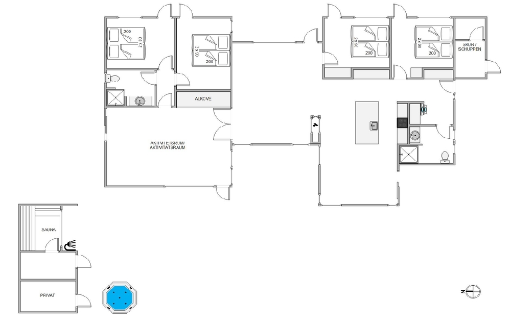 Die 4 Schlafzimmer sind im Ferienhaus ideal verteilt, sodass man sich jederzeit für ein wenig Privatsphäre oder ein Mittagsschläfchen gut zurückziehen kann. Die Zimmer sind alle mit bequemen Doppelbetten ausgestattet. Auch die 2 praktischen Badezimmer mit Dusche und Fußbodenheizung befinden sich in diesem Bereich ? so könnt ihr euch gut aufteilen. Im Flurbereich stehen eine Waschmaschine und ein Trockner als nützliche Haushaltshelfer für euch bereit.