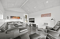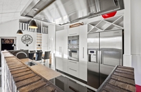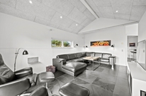 Der große Wohnraum mit der offenen Küche ist mit hochwertigen modernen Möbeln ausgestattet und lädt zu vielen schönen gemeinsamen Stunden ein. Hier können sich alle Hausbewohner versammeln und hier ist Platz für Groß und Klein. Bei schönem Wetter können sogar die großen Panoramascheiben beiseite geschoben werden, sodass der überdachte Teil der Terrasse den Wohnraum erweitert. An kühleren Tagen sorgt der Kaminofen für wohlige Wärme und eine kuschelige Atmosphäre.