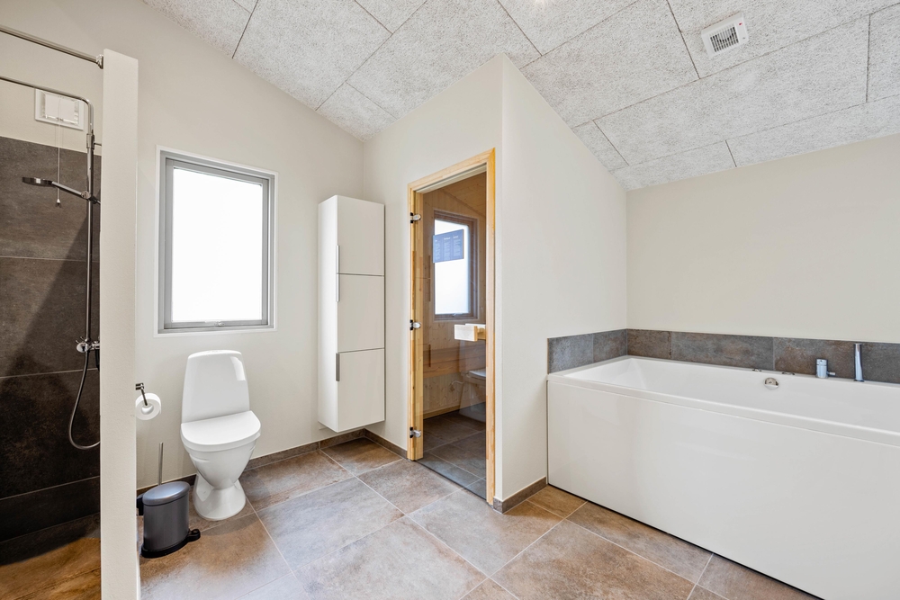 Auf der rechten Seite des Eingangs gibt es das große und schöne Badezimmer mit Dusche, Spa und Sauna: der Raum zur echten Entspannung. Das zweite Badezimmer enthält auch eine Dusche, damit es morgens nicht zur Warteschlange kommen muss. Auch um kalte Zehen braucht Ihr euch keine Sorgen zu machen, da beide Bäder mit Fußbodenheizung ausgestattet sind. Die praktische Waschmaschine im kleinen Badezimmer kann euch bei der Wäsche behilflich sein.
