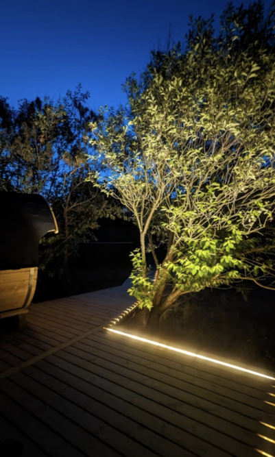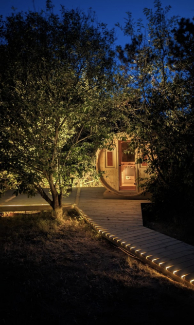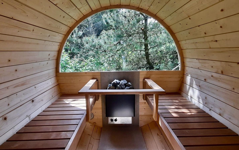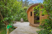 In der einer Ecke des Naturgrundstücks ist eine schöne Terrasse mit einen einzigartigen Außen Sauna angelegt worden, wo Ihr ganz Privat eine outdoor Wellnessstunde haben könnt.