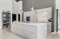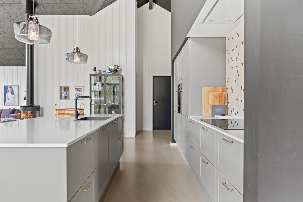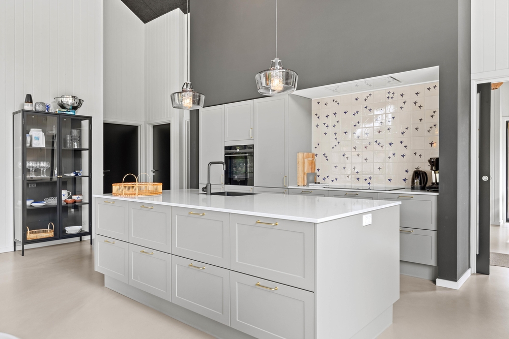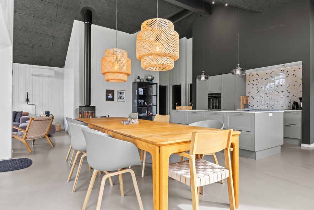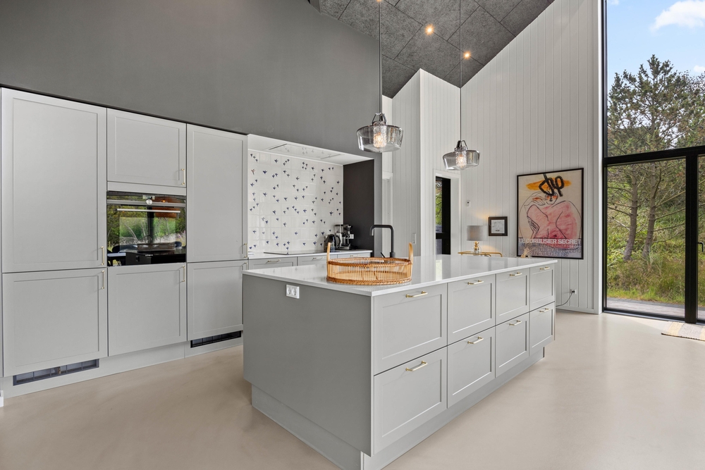 Durch die offene Gestaltung mit dem offenen Wohn-Ess-Küchenbereich fühlt sich niemand alleingelassen, und egal wo man sich in diesem Bereich aufhält ? der Holzofen ist immer sichtbar und sorgt für dänische ?Hygge?. Die offene Küche bietet allen Komfort, was für ein gelungenes Essen benötigt wird. Selbstverständlich muss sich niemand mit dem Abwasch abquälen. Dieser wird in der Spülmaschine erledigt. Das fabelhafte Ferienhaus verfügt noch über eine energiesparende Wärmepumpe, die für angenehme Temperaturen im Feriendomizil sorgt.