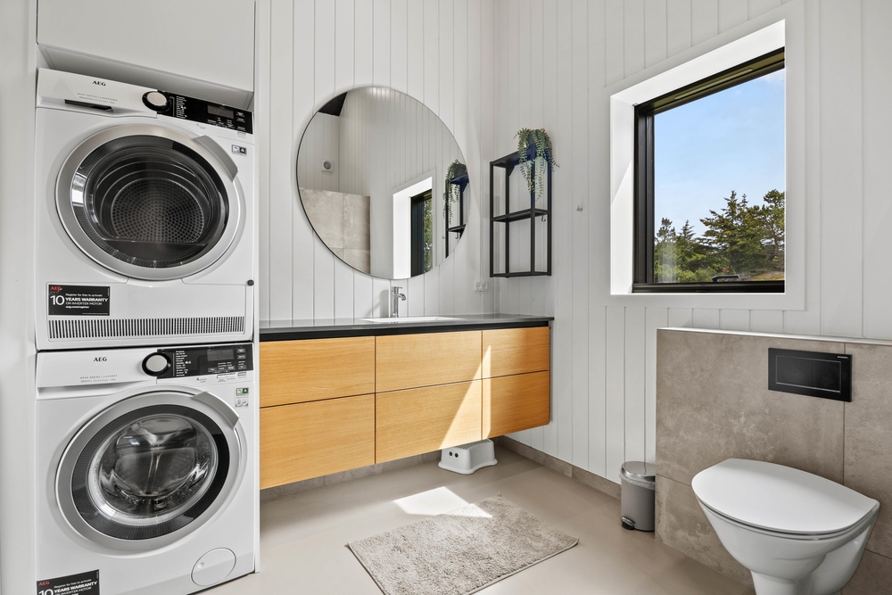 Ihr findet hier 2 Bäder, Waschmaschine, Wäschetrockner und eine energiesparende Wärmepumpe. Die Endreinigung ist in diesem Sommerhaus gratis.