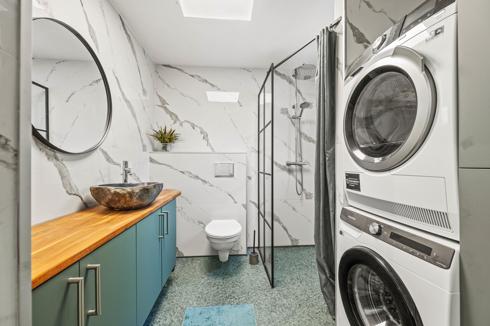 Die Fußbodenheizung im Badezimmer sorgt für angenehme Wärme, während die vorhandene Waschmaschine und der Trockner jederzeit für frische Wäsche sorgen.