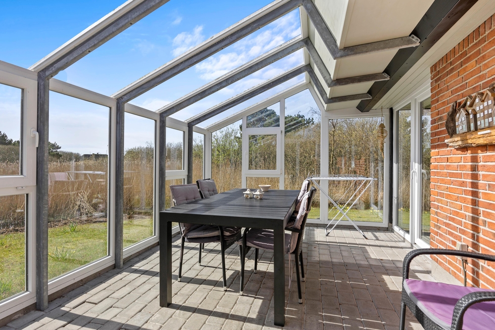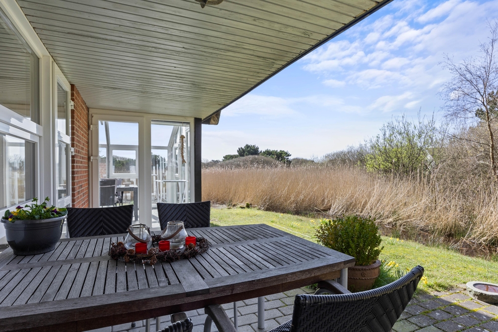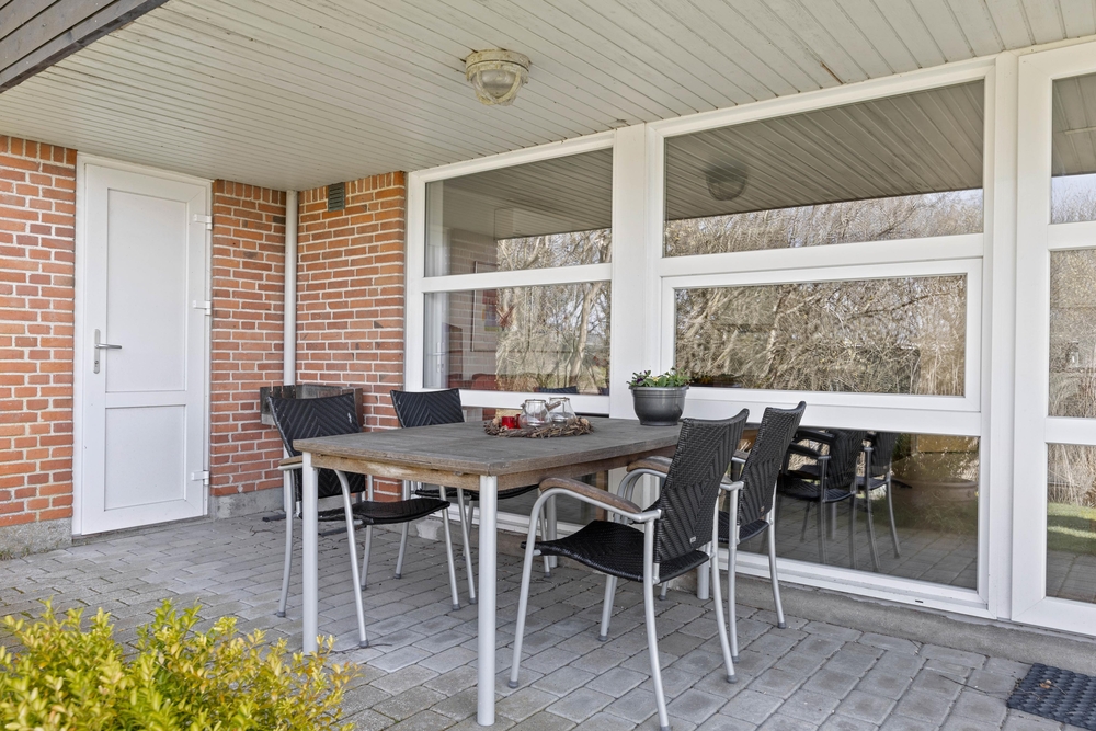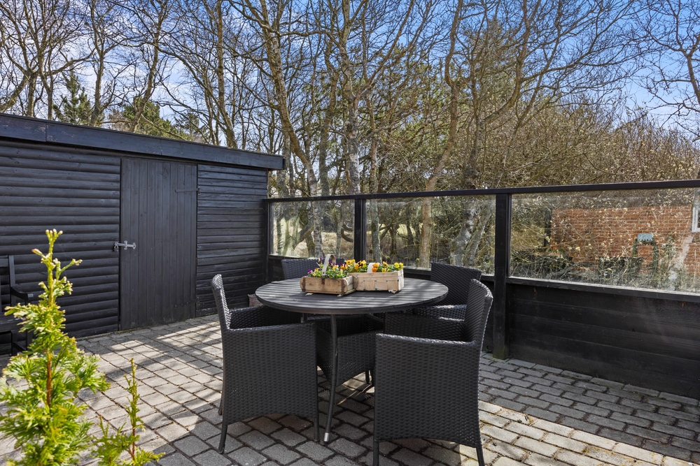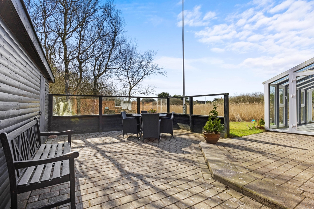 Vom Wohnzimmer aus gibt es einen direkten Zugang zur Terrasse des Ferienhauses, die teilweise überdacht und abgeschirmt ist. Hier kann die ganze Familie an heißen Sommertagen und warmen Abenden gemütliche Momente verbringen. Während ihr eine Tasse Kaffee auf der Terrasse genießt, können die Kinder im Naturbereich spielen.Einen erholsamen Tag sollte auch entspannt ausklingen ? und was wäre da besser geeignet als ein gemütliches Barbecue auf der Terrasse?