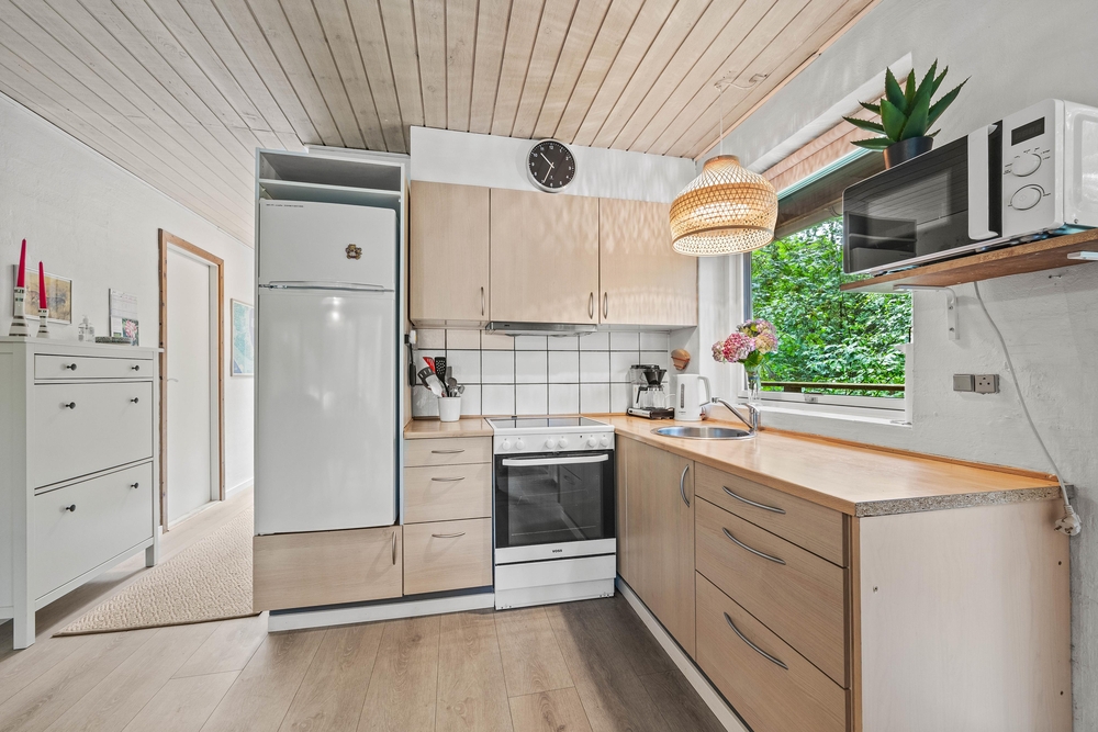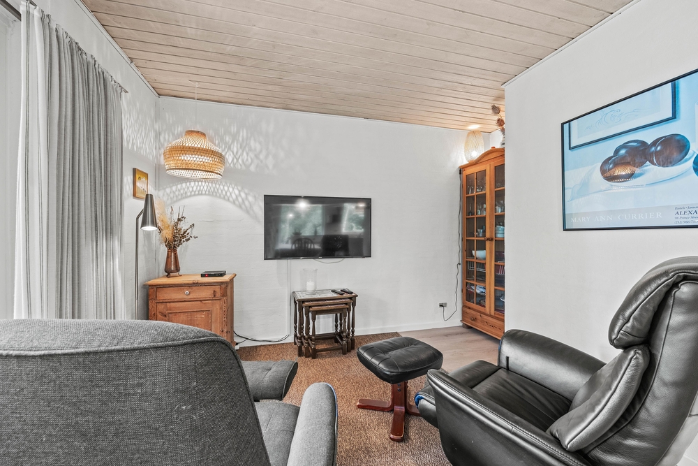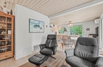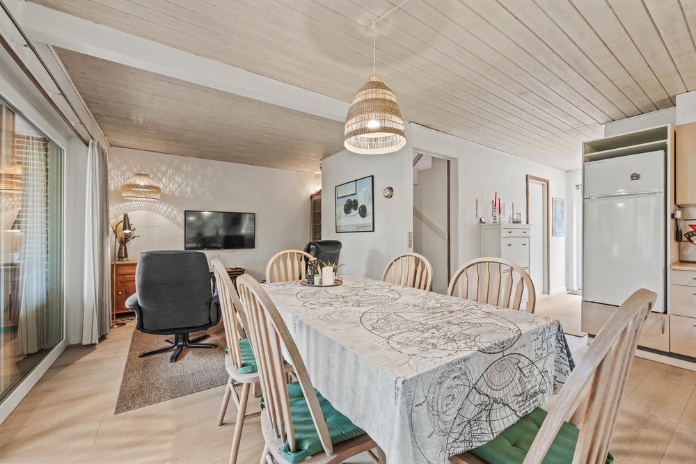 Beim Betreten des Ferienhauses werdet ihr euch bestimmt von Anfang an sehr wohl fühlen. Wie in den meisten dänischen Ferienhäusern üblich, gibt es einen zentralen Wohnraum, der Küche, Essplatz und Wohnzimmer vereint. In dem traditionellen Ferienhaus steht der gemütliche Wohnbereich im Fokus. Hier wurden Wohnzimmer, Küche und Esszimmer in einem einzigen Raum kombiniert.
