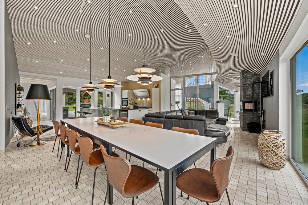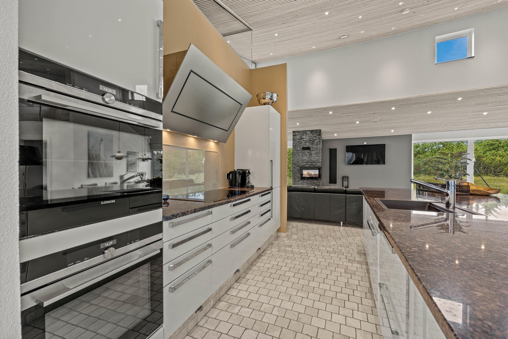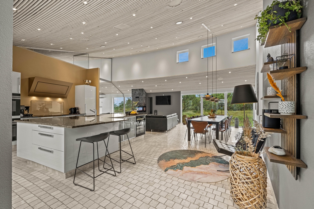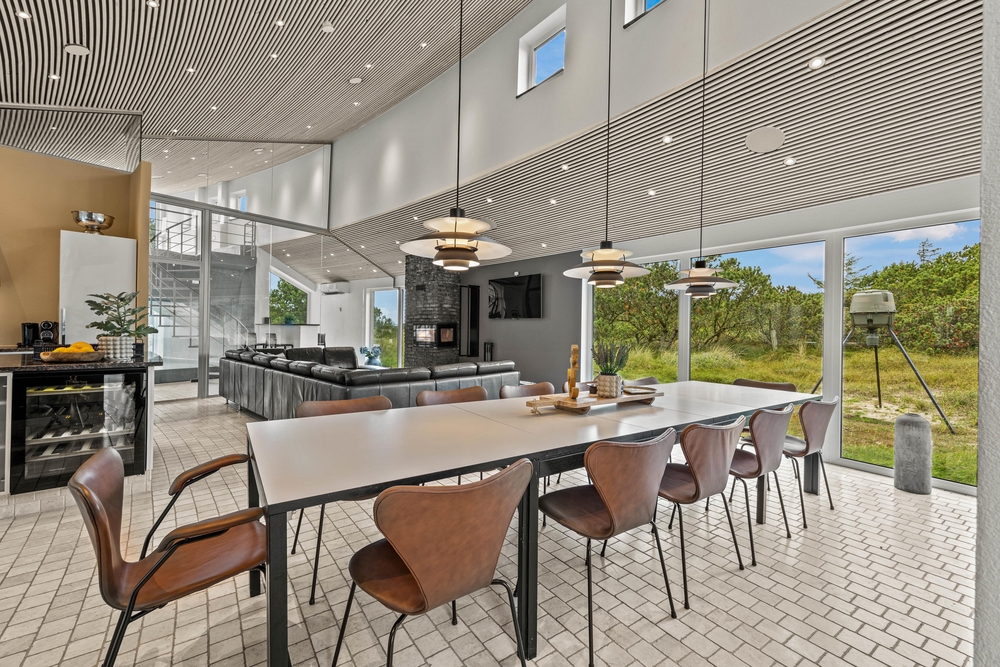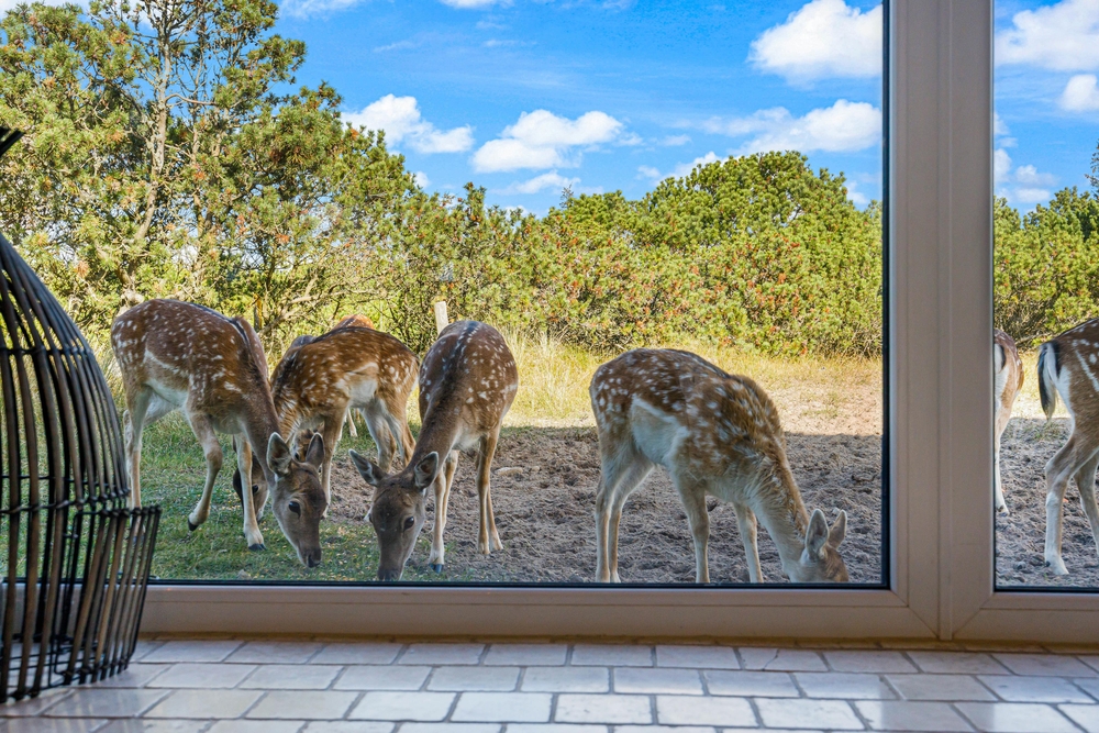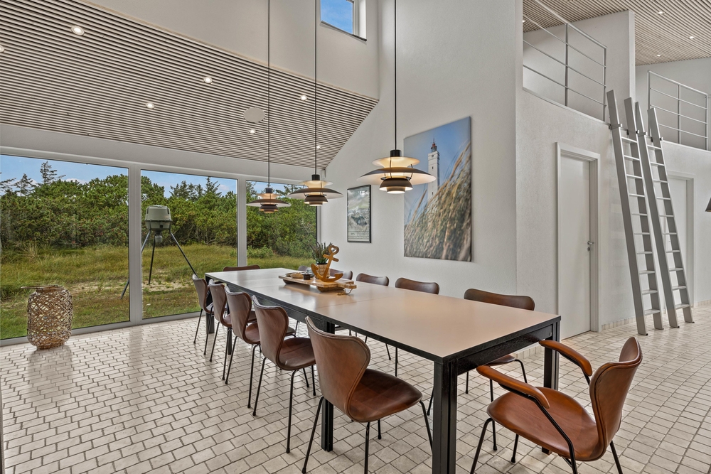 Der große Wohnbereich mit offener Küche und dem großen Esstisch ist der Ort an dem Ihr gemeinsame Stunden verbringen könnt. Durch die großen Fenster die sich über die gesamte Hausfront verteilen, hat man das Gefühl man sitzt mitten in der Natur der dänischen Westküste. Da das Grundstück direkt an ein großes Naturschutzgebiet angrenzt, werden die einzigen Besucher auf dem geschützten Grundstück, ein paar Rehe oder Hasen sein.