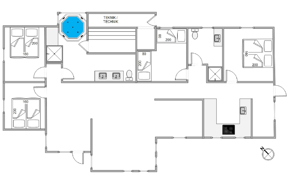 Das Haus ist mit seinen insgesamt 147 m2 gut aufgeteilt und bietet ausreichend Platz für Alle. Das Zentrum dieses Ferienhauses bildet unumstritten der grosse Wohn- und Essbereich mit integrierter Einbauküche. Hier kann gleichzeitig auf dem Sofa relaxt werden, während die Hobbyköche neueste Kreationen aus dem Internet ausprobieren und eure Gaumen später damit verwöhnen werden.