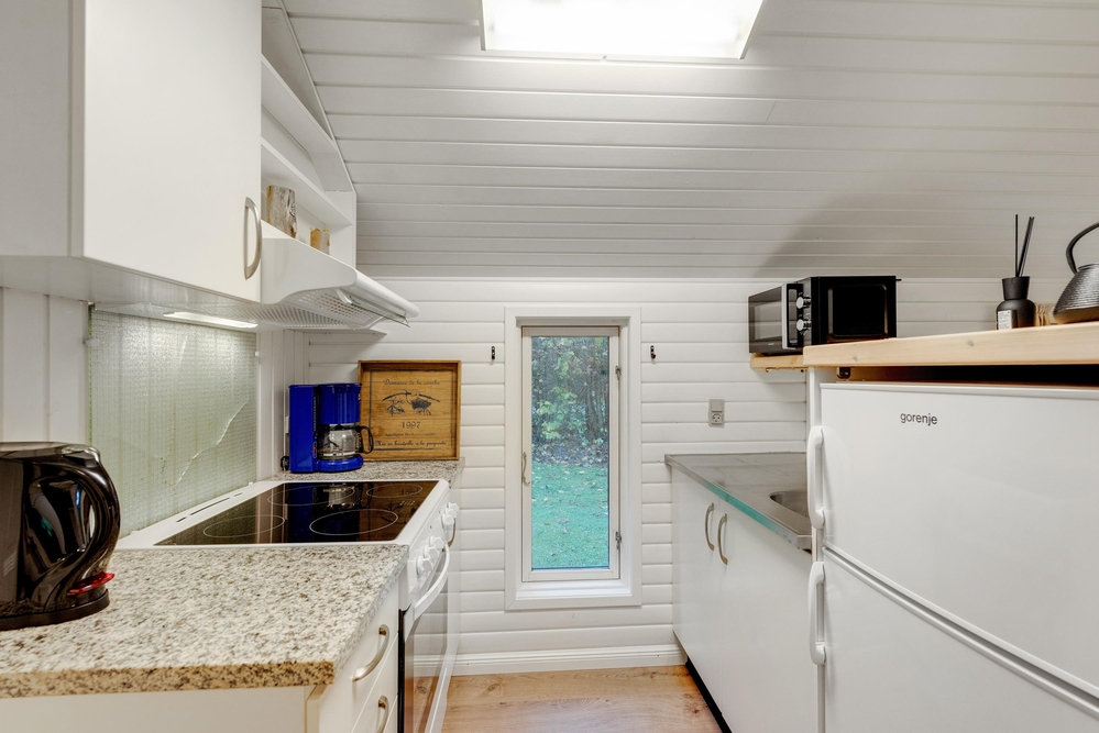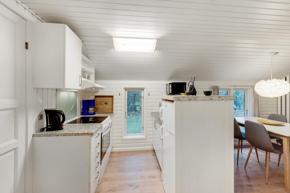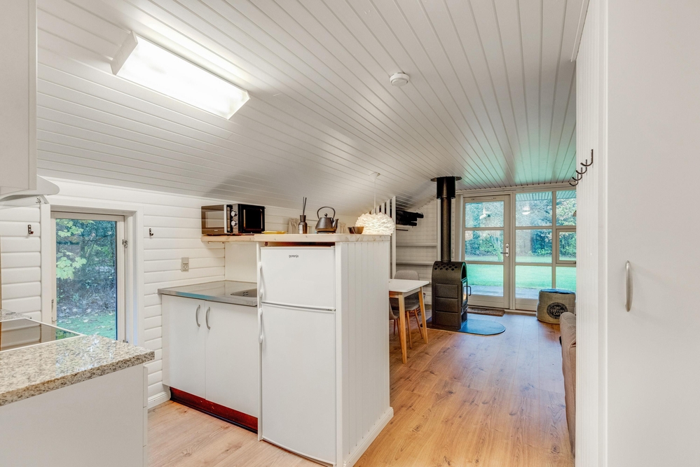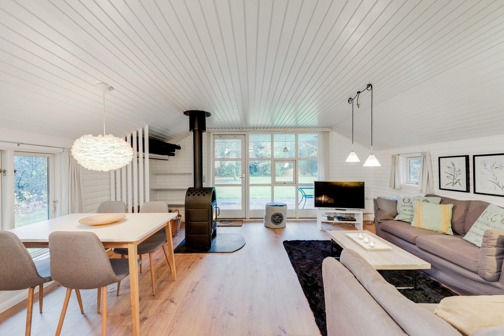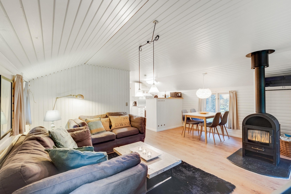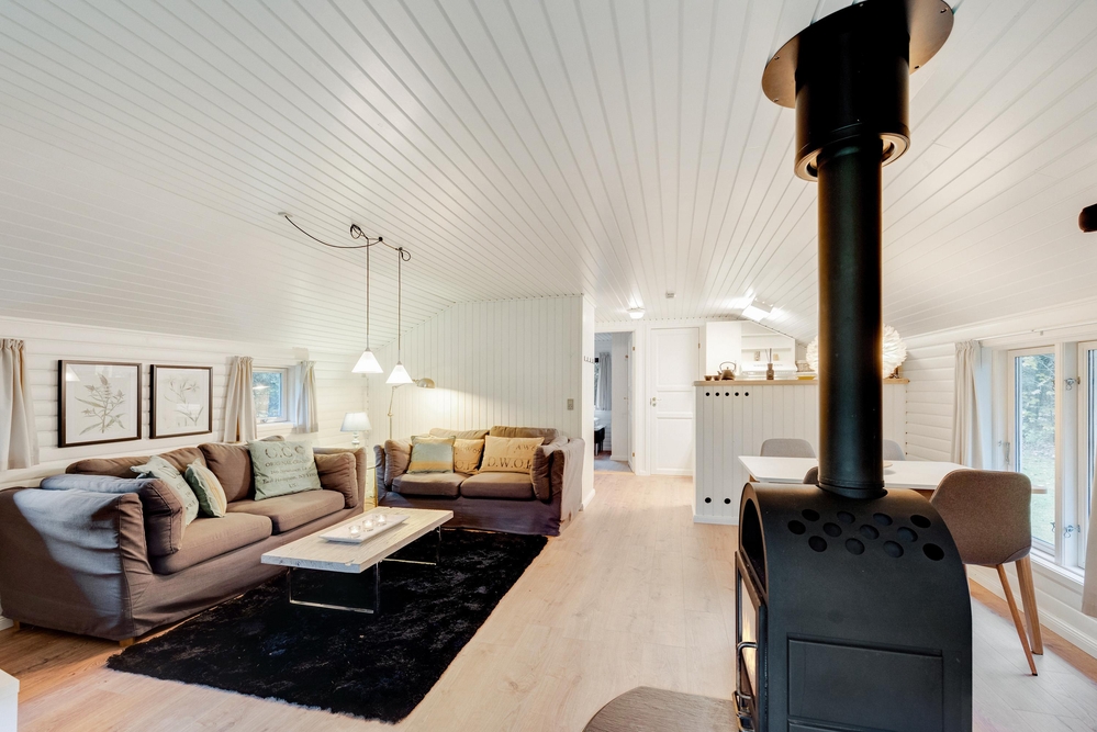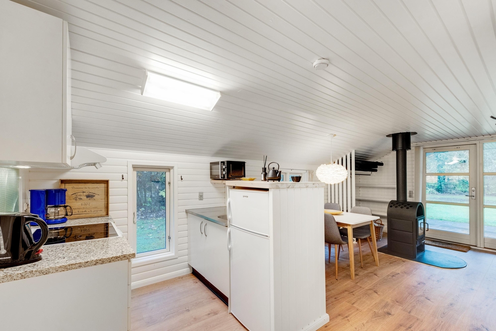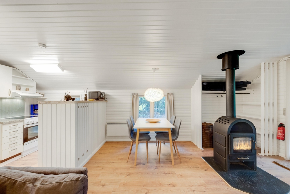 Das Wohnzimmer ist das Herzstück des Ferienhauses und lädt mit einer behaglichen Atmosphäre zum Entspannen ein. Der Kaminofen sorgt dabei an kühleren Abenden für wohlige Wärme und schafft eine einladende Stimmung. Der offene Raum bietet zudem Zugang zur Terrasse. Die Küche ist ebenfalls offen gestaltet und funktional ausgestattet. An dem direkt angrenzenden Esstisch könnt ihr gemeinsam ein Frühstück genießen und den Tag planen.