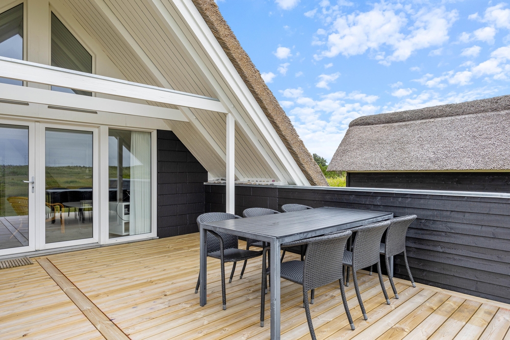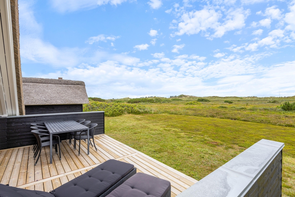 Vom Wohnzimmer gelangt ihr direkt auf die Südterrasse des Ferienhauses. Hier gibt es immer Schutz und Schatten, da ein Teil der Terrasse sowohl abgeschirmt als auch überdacht ist. Wenn ihr vollen Sonnenschein bevorzugt, könnt ihr euch auf den Liegestühlen auf dem offenen Teil der Terrasse zurücklehnen. Es gibt auch einen Tisch und eine Bank auf dem Grundstück, wo ihr ein schönes Picknick in der Sonne machen könnt. Von der Terrasse habt ihr einen schönen Blick auf die unberührte Heide im Süden.