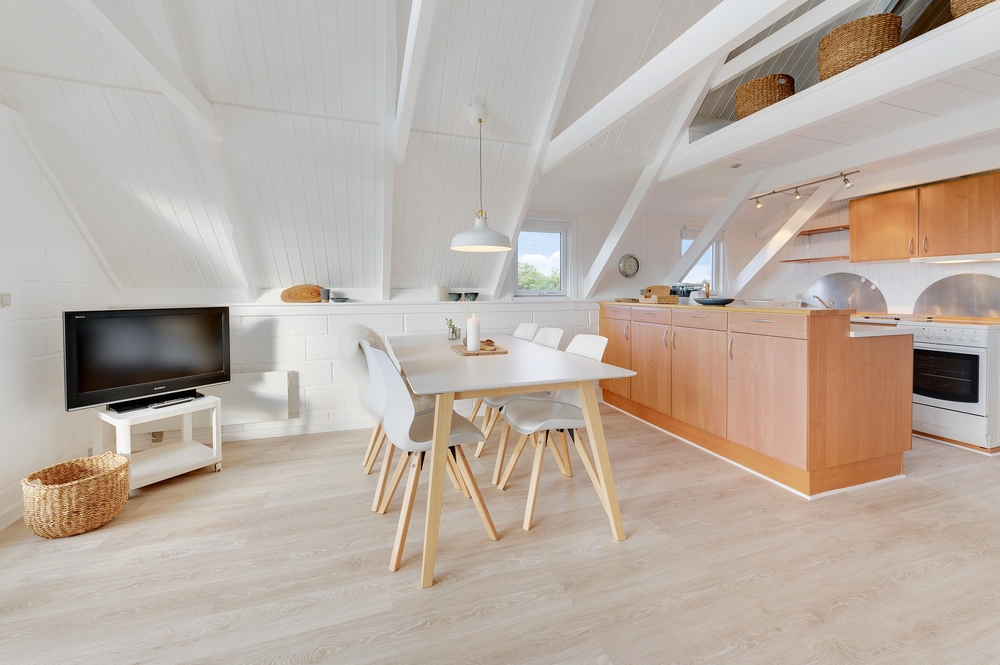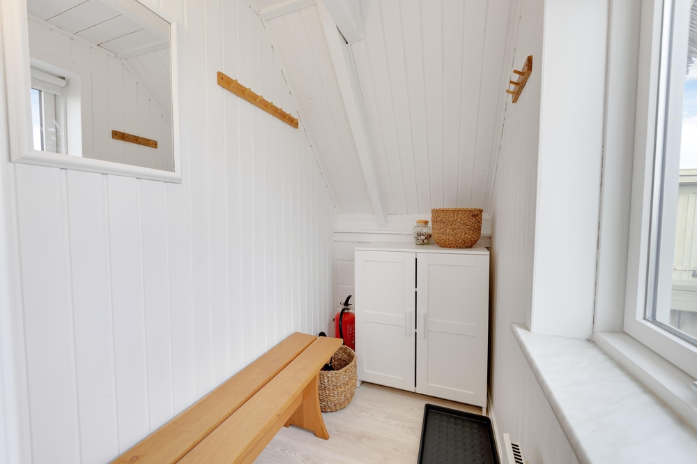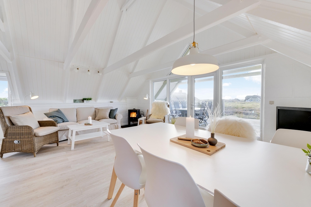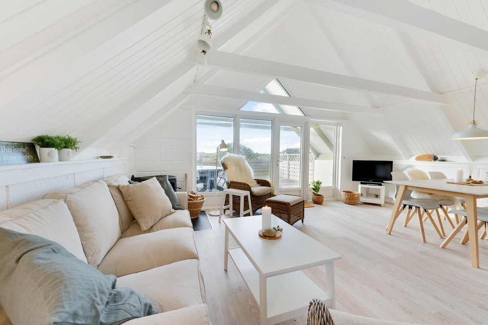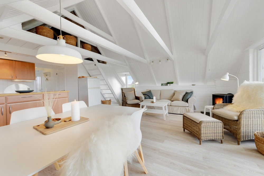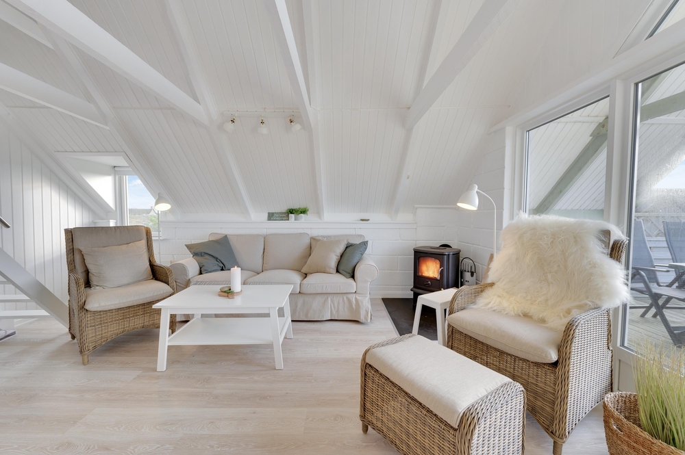 Hängt eure Kleidung an den Garderobenhaken und tritt herein in das gemütliche Wohnzimmer mit Kaminofen und Decken bis zum First. Die helle Innengestaltung unter der Verwendung von naturbelassenen Farbtönen gibt dem Raum eine wohlige Atmosphäre und lädt zum Verweilen ein.