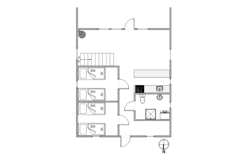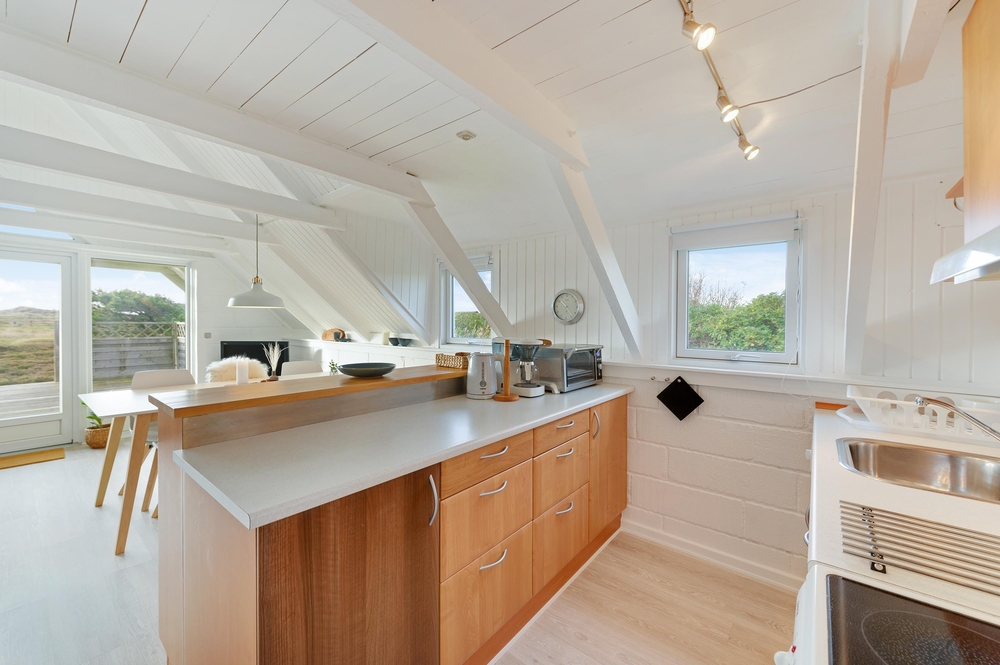 Durch die große Fensterfront im Wohnbereich habt ihr einen super Blick ins Freie und zugleich einen direkten Zugang zu der teilweise überdachten Holzterrasse. Die sich anschließende Küche ist klein, aber fein und lässt durch die offene Gestaltung auch zu, dass der Küchenchef den Überblick behält.