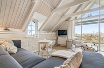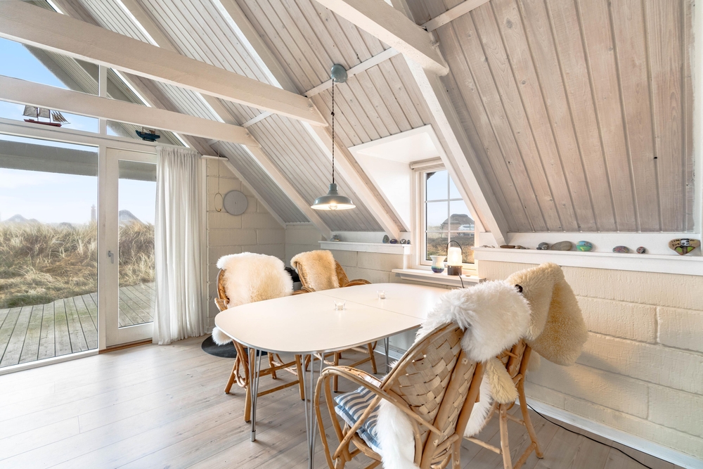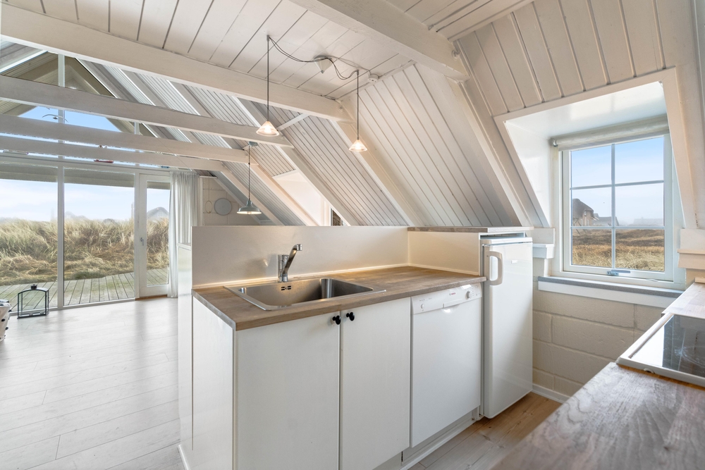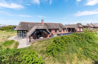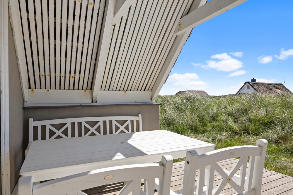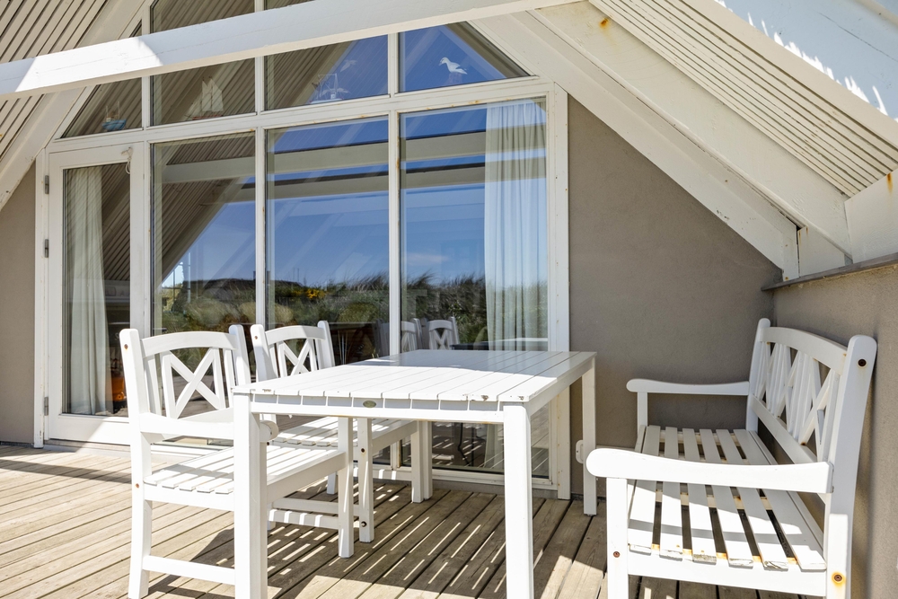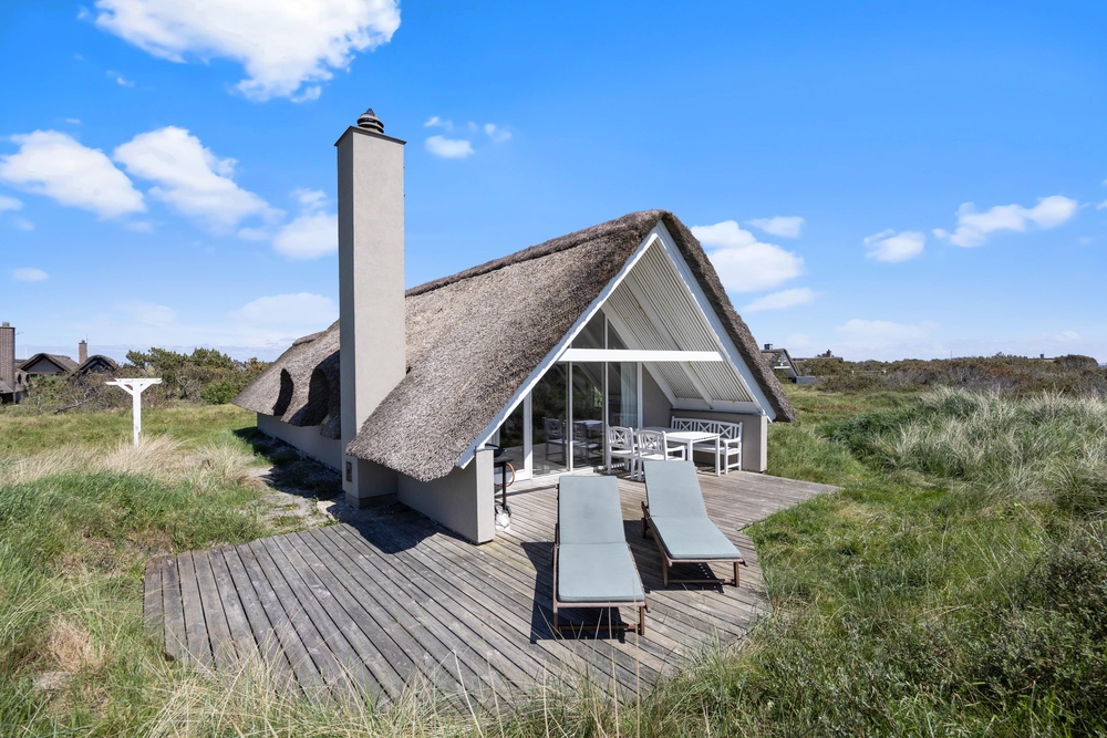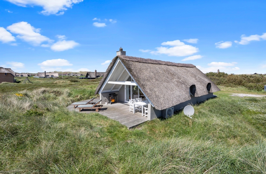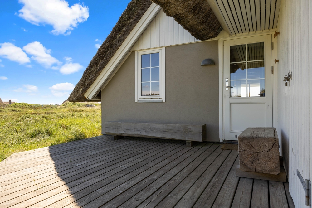 Das Ferienhaus liegt auf einem schönen, hügeligen Naturgrundstück, von dem aus ihr einen Panoramablick über die Heidelandschaft genießen könnt, der bis zum Leuchtturm von Lyngvig reicht. Die schöne Aussicht könnt ihr von der Südterrasse genießen, wo ihr es euch auf den vorhandenen Gartenmöbeln und Liegestühlen bequem machen könnt. Die Terrasse ist teilweise überdacht, sodass ihr bei Bedarf auch ein schattiges Plätzchen finden könnt.Ihr könnt das Abendessen auf dem Grill zubereiten und es auf der Terrasse genießen. Um den Tag optimal ausklingen zu lassen, sind es nur ca. 450 m zum Strand um hier den Sonnenuntergang von der Spitze der Dünen aus zu beobachten ? ein unvergessliches Erlebnis.