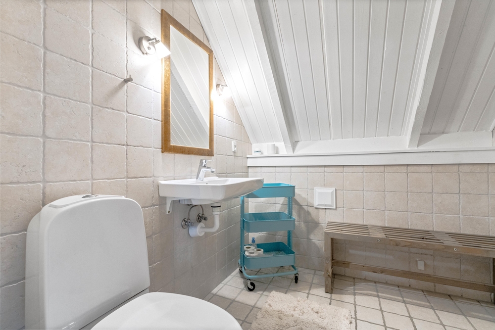 Das Ferienhaus hat 2 Schlafzimmer, eines mit einem Doppelbett und das andere mit 2 Einzelbetten. Auf dem Dachboden, den man vom Wohnzimmer aus erreichen kann, gibt es Platz für zusätzliche Betten, und die jüngsten Gäste im Urlaub werden wahrscheinlich zuerst hier schlafen wollen. Das Ferienhaus verfügt außerdem über ein Badezimmer mit Fußbodenheizung.