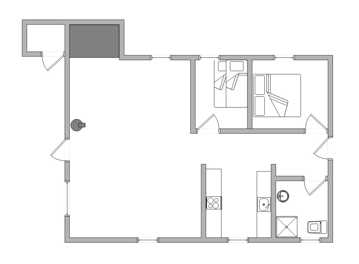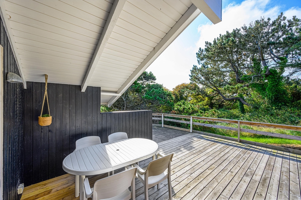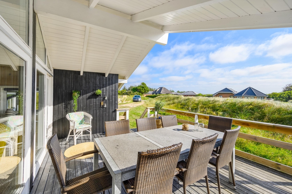 Vom Wohnbereich gelangt ihr auf die teilweise überdachte, abgeschirmte Terrasse. Das bedeutet, dass ihr die frische Luft auch bei etwas unbeständigem Wetter genießen könnt. Abends könnt ihr dann den Grill für ein leckeres Barbecue nutzen und den Ausblick genießen.