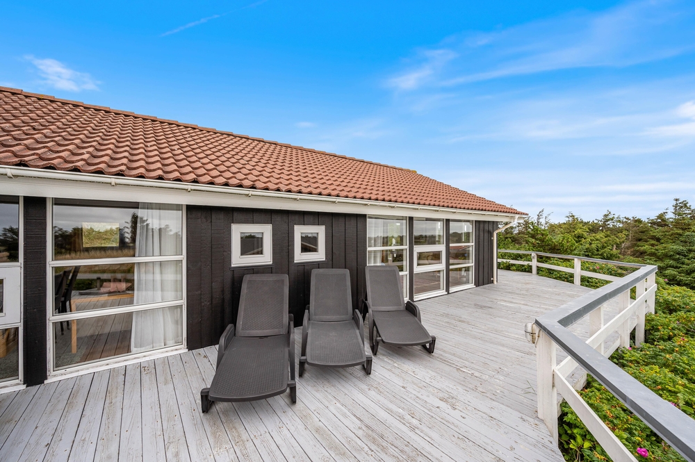 Vom Ferienhaus aus habt ihr eine einzigartige Aussicht über die westjütländische Landschaft. Es gibt nichts Schöneres, als aufzustehen, sich eine Tasse Kaffee zu kochen und auf die Terrasse zu gehen, wo man den fantastischen Panoramablick genießen kann. Wenn die Sonne scheint, ist es natürlich eine gute Idee, den Tag bei schönem Wetter draußen zu verbringen, und auf der schönen Terrasse stehen die Gartenmöbel und Liegestühle schon für euch bereit. Für die Kleinsten gibt es im Garten eine Schaukel und einen Sandkasten.