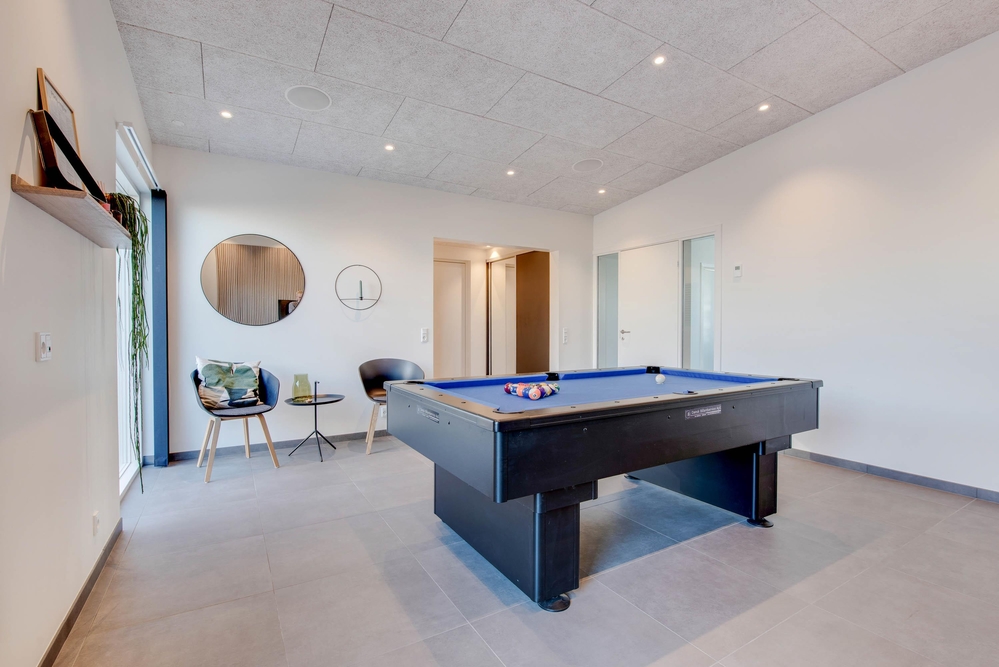 Wer Lust auf ein wenig Action und Spaß hat, lädt sein Gegenüber zu einem Billardmatch ein. Wie auch von diesem Raum habt ihr eine fantastische Aussicht auf die Umgebung rund um das Ferienhaus. Wer mehr auf totale Entspannung und Ruhe steht, nimmt im warmen Wasser der Badetonne Platz oder lässt sich einmal so richtig in der Sauna aufwärmen.