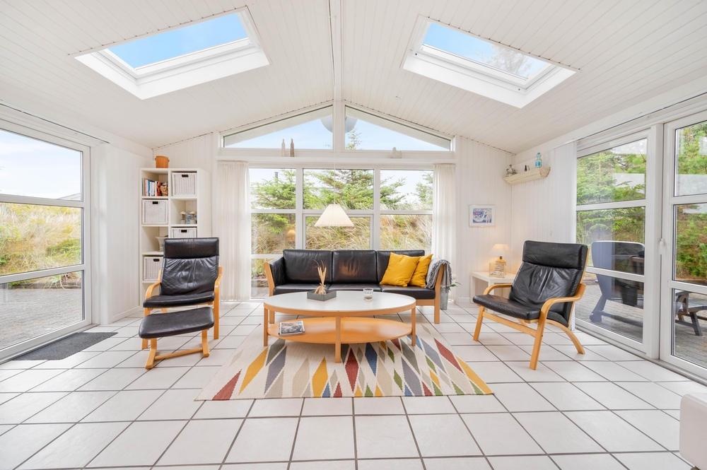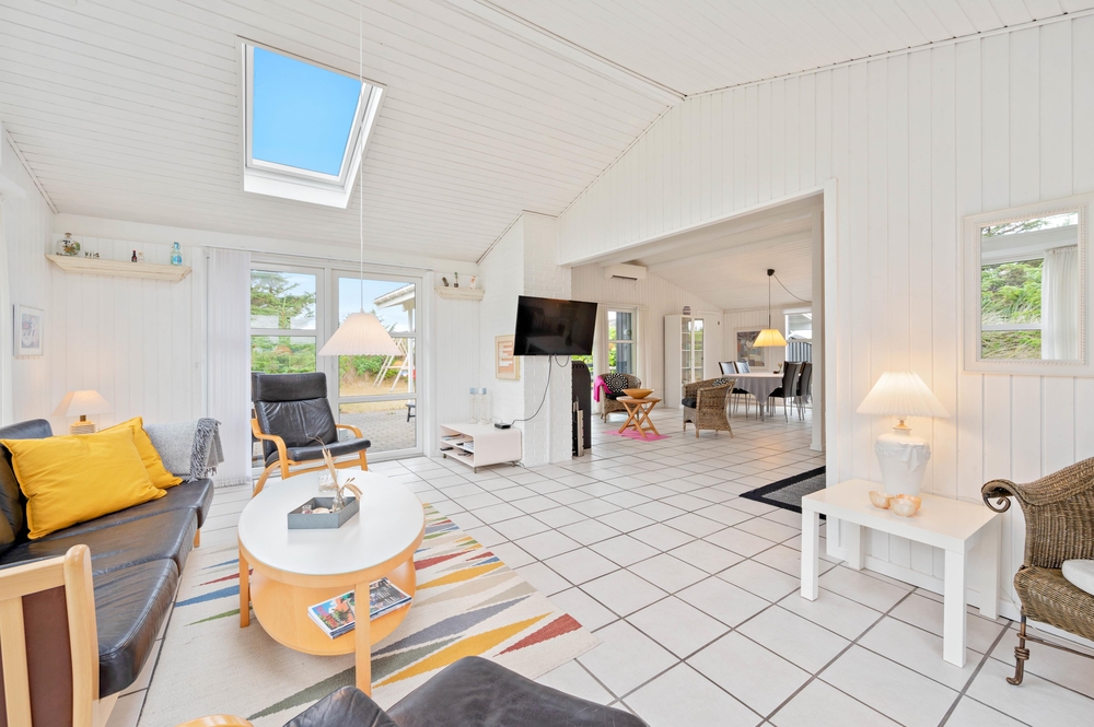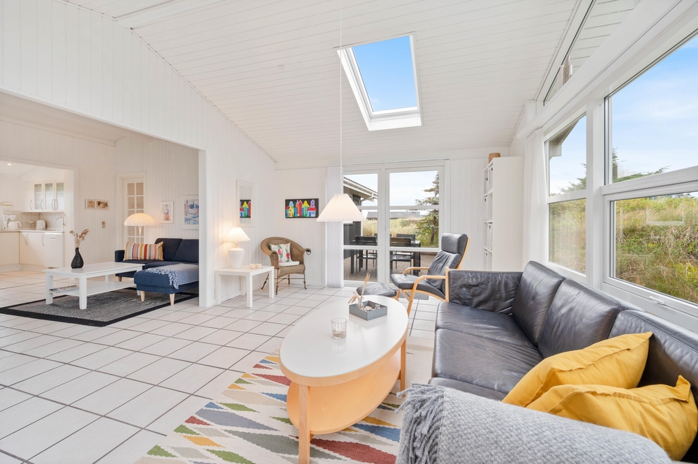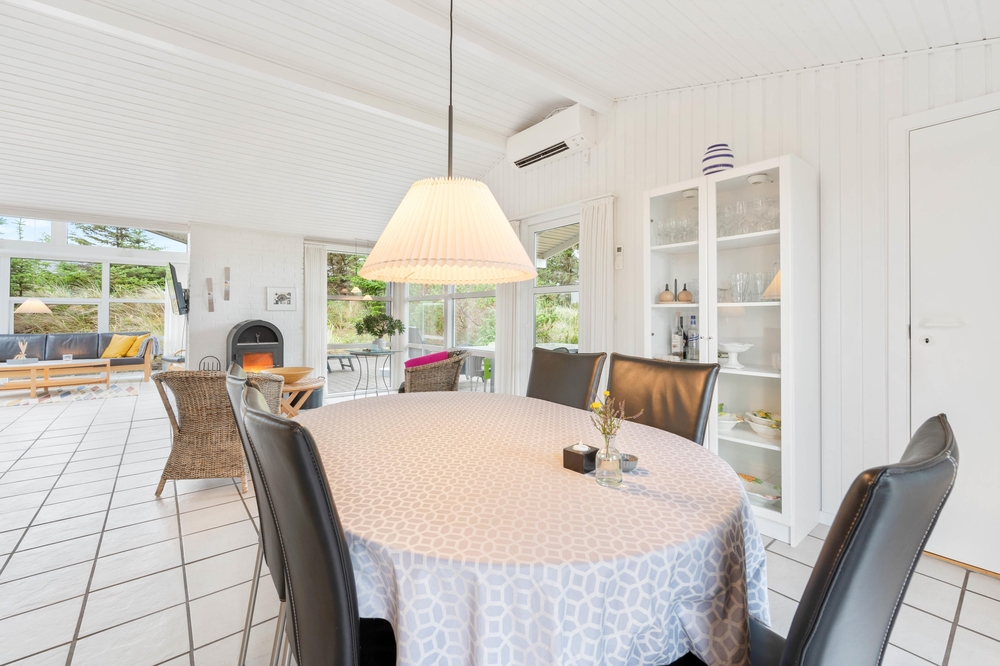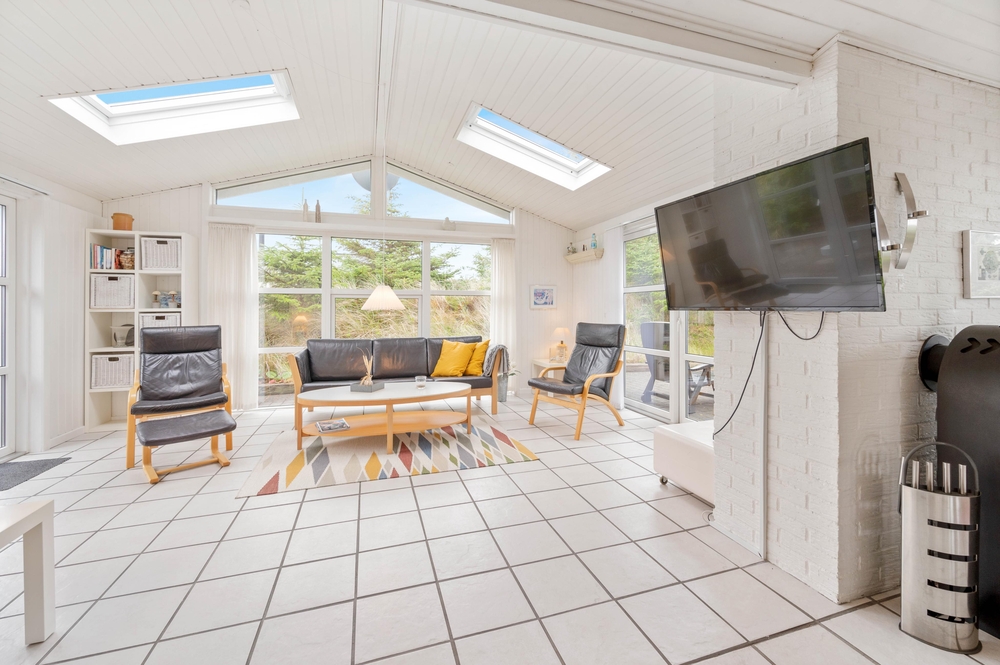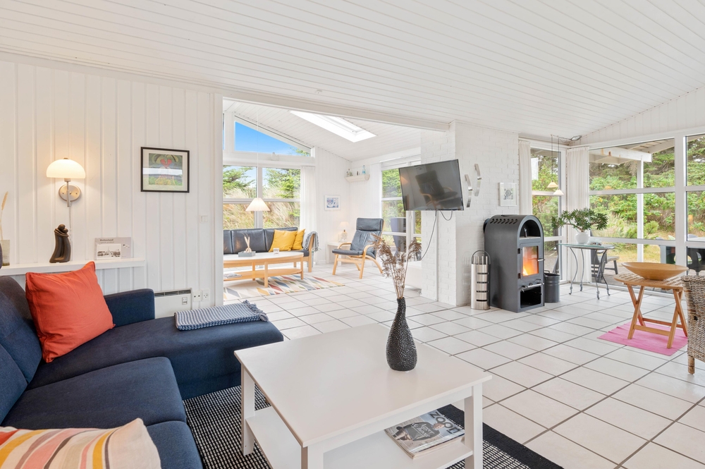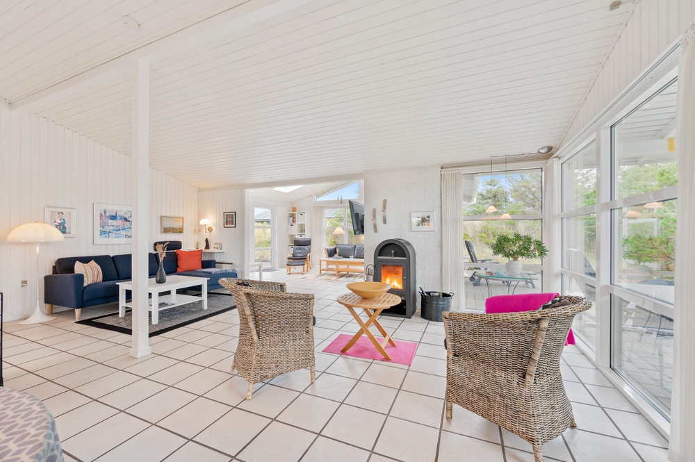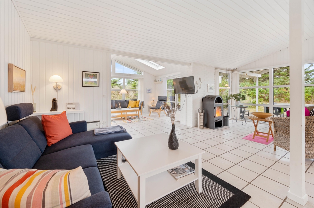 In dem Ferienhaus werdet ihr euch sofort wie zu Hause fühlen. Mit seinen weißen Wänden und dem fantastischen Licht ist das Ferienhaus herrlich hell und einladend. Das schafft eine schöne Atmosphäre, in der ihr euren Urlaub verbringen könnt. Das Ferienhaus ist groß und geräumig, und alle werden sich hier wie zu Hause fühlen. Das große Wohnzimmer bildet den Rahmen für viele gemütliche gemeinsame Urlaubsmomente für die ganze Familie mit gutem Essen, lustigen Spielen und guten Filmen. Damit ihr euch wirklich zurücklehnen und euren Urlaub genießen könnt, stehen euch bequeme Sofas und Sessel bereit. Der Holzofen verleiht der Gemütlichkeit den letzten Schliff und sorgt für die typische Ferienhausatmosphäre.