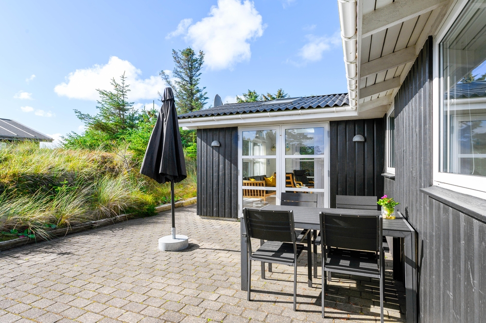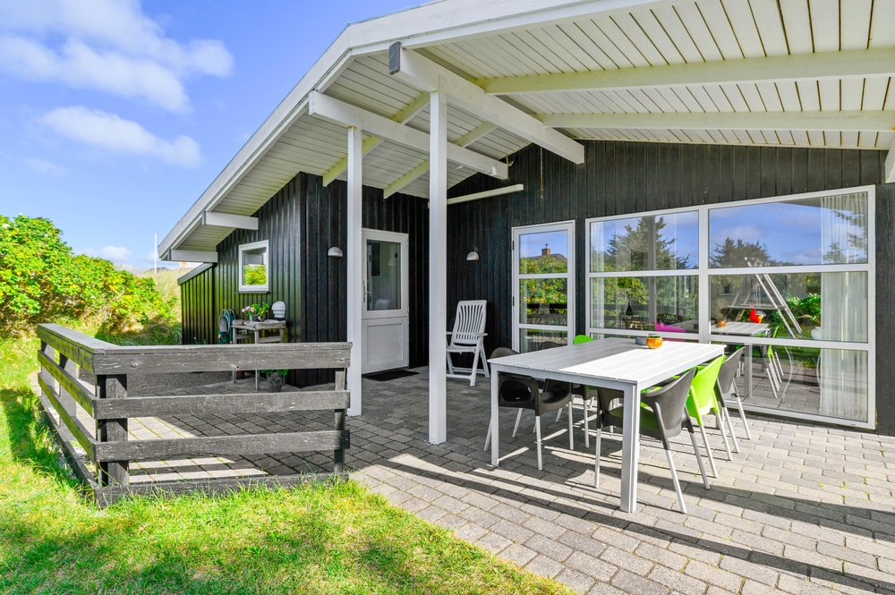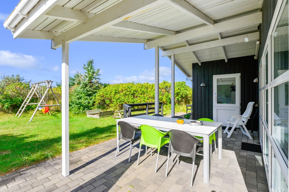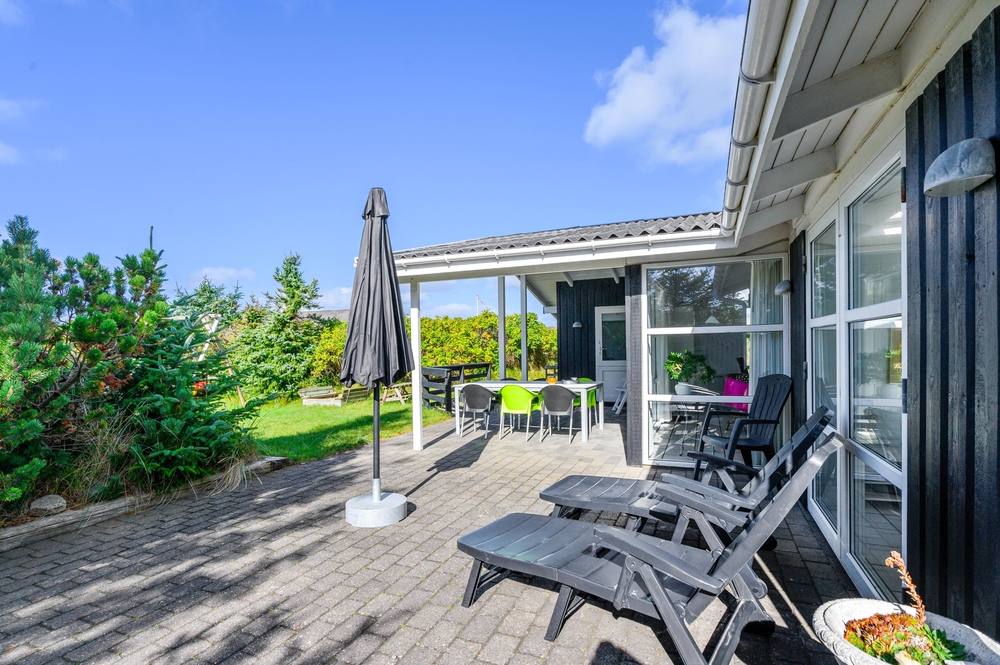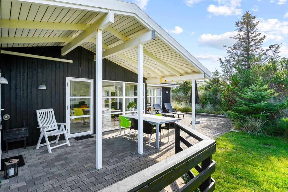 An der Süd- und Westseite des Ferienhauses verläuft eine offene Terrasse, die teilweise überdacht ist. Hier findet ihr ein gutes Plätzchen in der Sonne, um die warmen Strahlen zu genießen ? und wenn ihr lieber im Schatten sitzen möchtet, könnt ihr es euch unter dem überdachten Teil der Terrasse gemütlich machen. Liegestühle und Gartenmöbel sind vorhanden, sodass es euch an heißen Urlaubstagen an nichts fehlen wird.